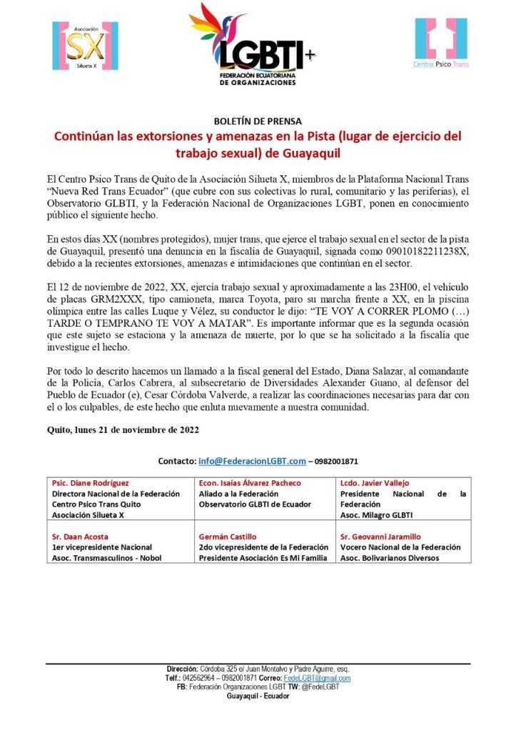 En estos días XX (nombres protegidos), mujer trans, que ejerce el trabajo sexual en el sector de la pista de Guayaquil, presentó una denuncia en la fiscalía de Guayaquil, signada como 09010182211238X, debido a la recientes extorsiones, amenazas e intimidaciones que continúan en el sector.