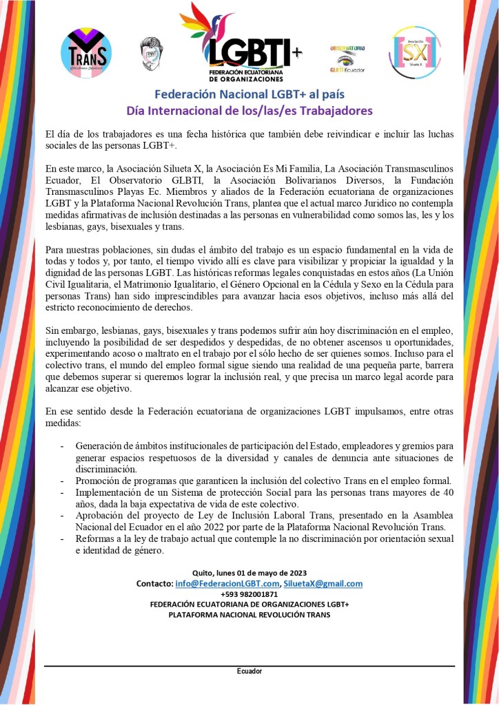 En este marco, la Asociación Silueta X, la Asociación Es Mi Familia, La Asociación Transmasculinos Ecuador, El Observatorio GLBTI, la Asociación Bolivarianos Diversos, la Fundación Transmasculinos Playas Ec. Miembros y aliados de la Federación ecuatoriana de organizaciones LGBT y la Plataforma Nacional Revolución Trans, plantea que el actual marco Juridico no contempla medidas afirmativas de inclusión destinadas a las personas en vulnerabilidad como somos las, les y los lesbianas, gays, bisexuales y trans.