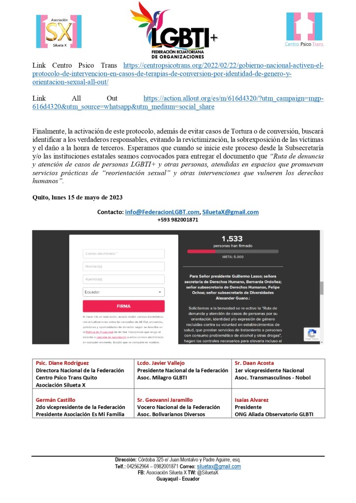 Es importante indicar además que, el protocolo que hemos solicitado desde el nacimiento del Centro Psico Trans de Quito en el año 2019 al estado ecuatoriano, pueda articularse entre los Ministerios de Salud, de la Mujer y Derechos Humanos, Fiscalía, Policía Nacional, Defensoria del Pueblo, etc. con el fin de tener una mirada multidisciplinaria. Este pedido incluso lo hicimos en redes sociales, a partir de nuestra campaña en All Out en 2022.