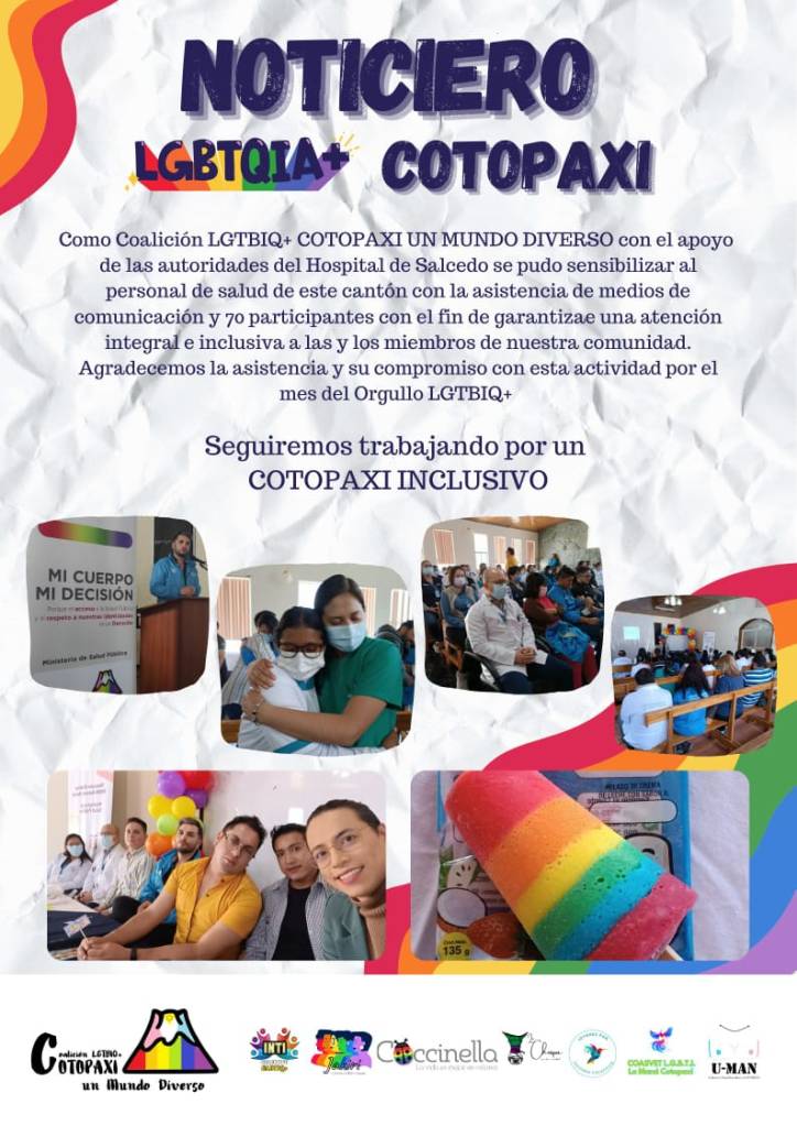 Como Coalición LGTBIQ+ COTOPAXI UN MUNDO DIVERSO con el apoyo de las autoridades del Hospital de Salcedo (provincia de Cotopaxi) se pudo sensibilizar al personal de salud de este cantón con la asistencia de medios de comunicación y 70 participantes con el fin de garantizar una atención integral e inclusiva a las y los miembros de nuestra comunidad. Agradecemos la asistencia y su compromiso con esta actividad por el mes del Orgullo LGTBIQ+