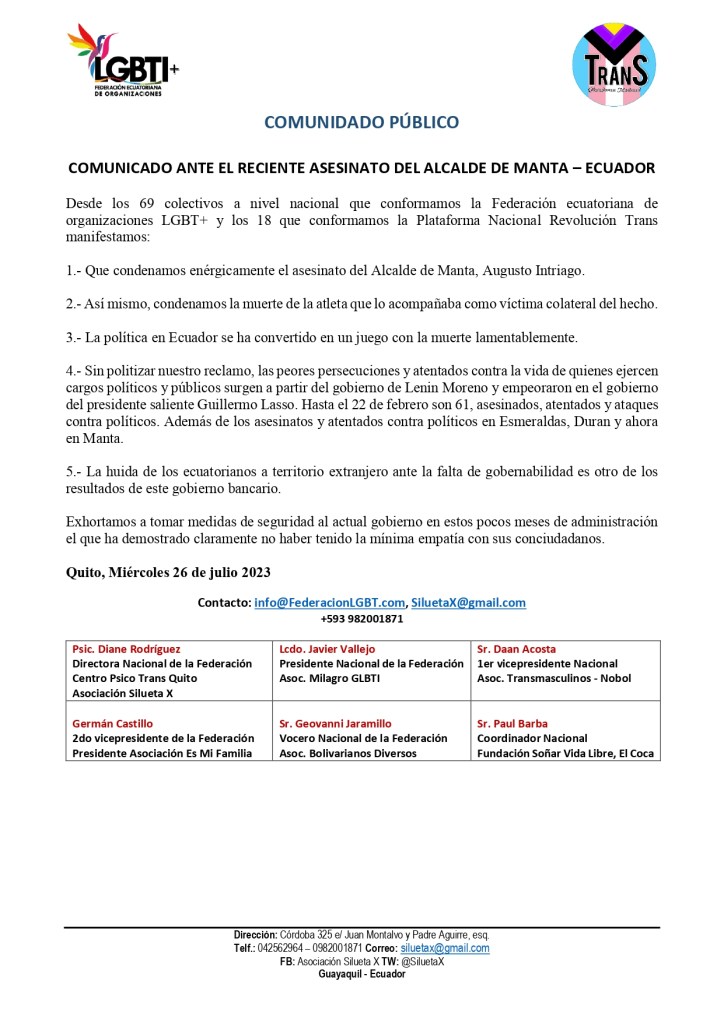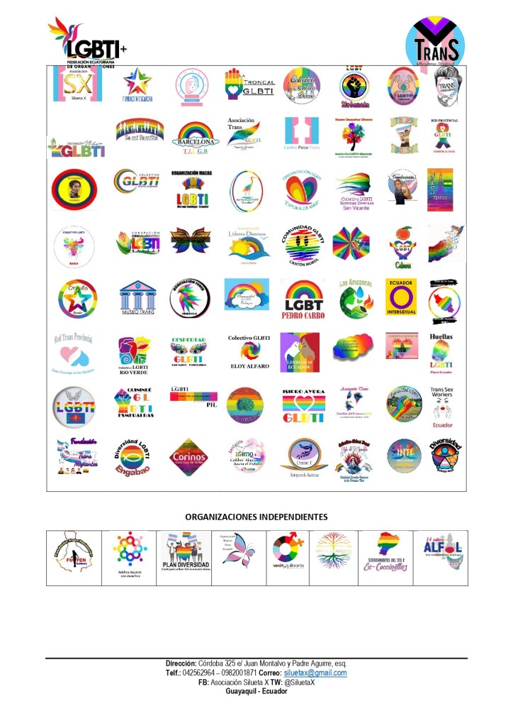 Desde los 69 colectivos a nivel nacional que conformamos la Federación ecuatoriana de organizaciones LGBT+ y los 18 que conformamos la Plataforma Nacional Revolución Trans manifestamos: