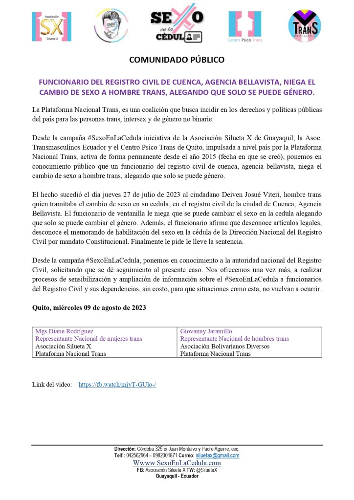 Desde la campaña #SexoEnLaCedula iniciativa de la Asociación Silueta X de Guayaquil, la Asoc. Transmasculinos Ecuador y el Centro Psico Trans de Quito, impulsada a nivel país por la Plataforma Nacional Trans, activa de forma permanente desde el año 2015 (fecha en que se creó), ponemos en conocimiento público que un funcionario del registro civil de cuenca, agencia bellavista, niega el cambio de sexo a hombre trans, alegando que solo se puede género.