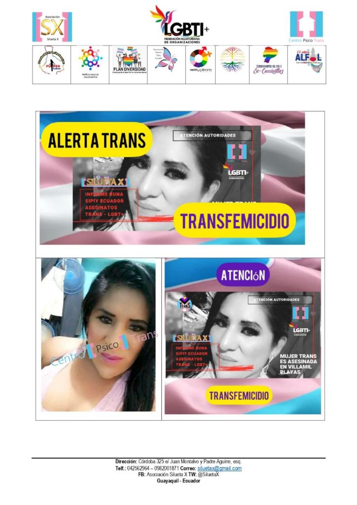 El Centro Psico Trans de Quito de la Asociación Silueta X, miembros de la Plataforma Nacional Revolución Trans (que cubre con sus colectivas lo rural, comunitario y las periferias) y la Federación ecuatoriana de Organizaciones LGBT+, ponen en conocimiento público el siguiente hecho.