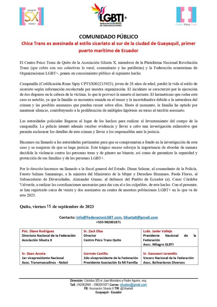 Por lo descrito hacemos un llamado a la fiscal general del Estado, Diana Salazar, al comandante de la Policía, Fausto Salinas Samaniego, a la ministra del Ministerio de la Mujer y Derechos Humanos, Paola Flores, al Subsecretario de Diversidades, Alexander Guano, al defensor del Pueblo de Ecuador (e), Cesar Córdoba Valverde, a realizar las coordinaciones necesarias para dar con el o los culpables, de este hecho. Con el presente, se han registrado cerca de veinte y dos asesinatos en contra de nuestras poblaciones LGBT+ en lo que va de este 2023.