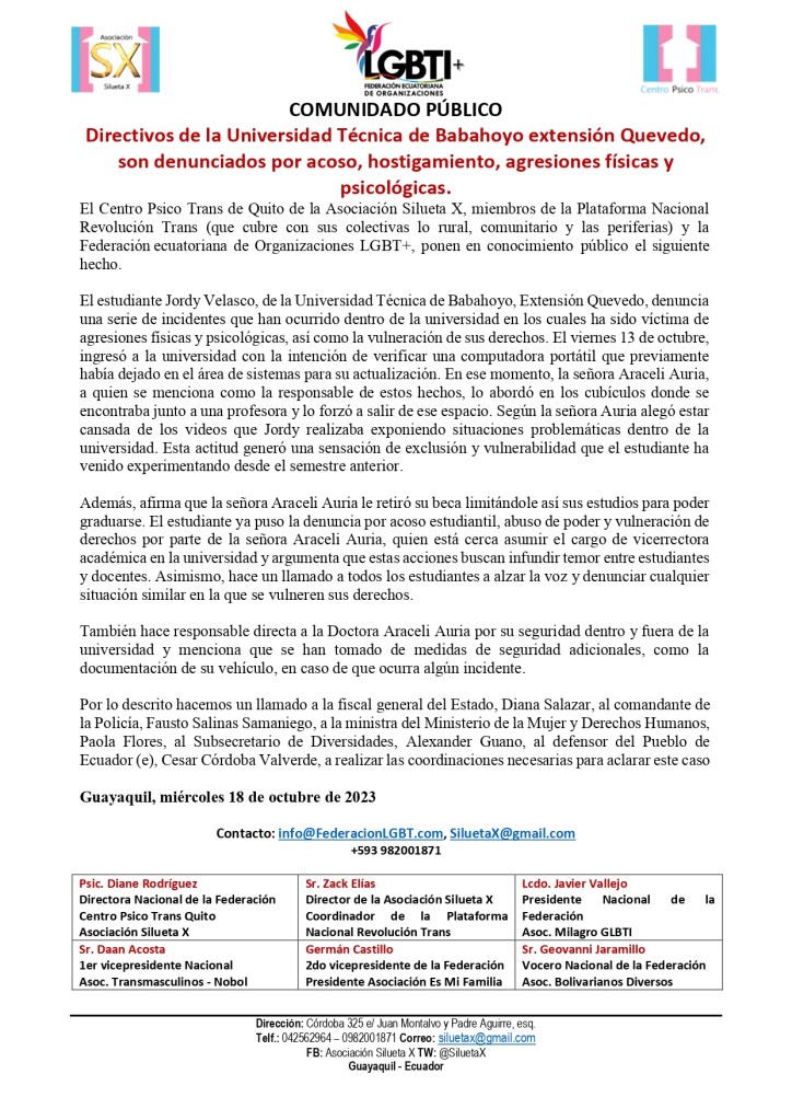 El Centro Psico Trans de Quito de la Asociación Silueta X, miembros de la Plataforma Nacional Revolución Trans (que cubre con sus colectivas lo rural, comunitario y las periferias) y la Federación ecuatoriana de Organizaciones LGBT+, ponen en conocimiento público el siguiente hecho.