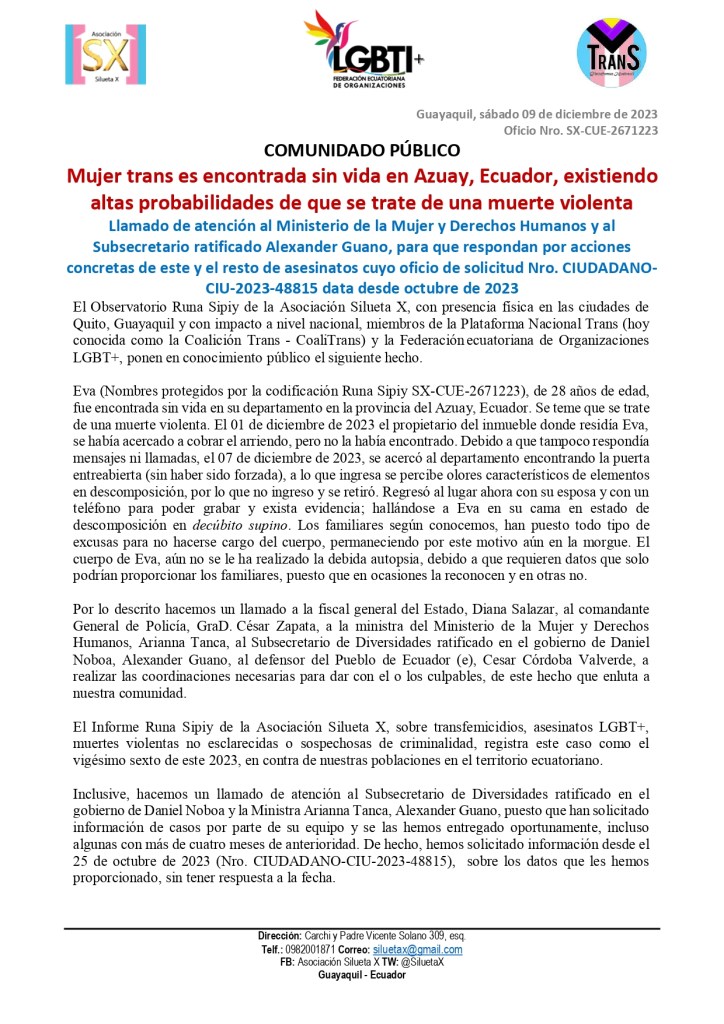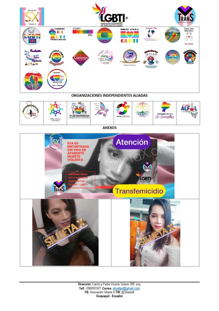 El Observatorio Runa Sipiy de la Asociación Silueta X, con presencia física en las ciudades de Quito, Guayaquil y con impacto a nivel nacional, miembros de la Plataforma Nacional Trans (hoy conocida como la Coalición Trans – CoaliTrans) y la Federación ecuatoriana de Organizaciones LGBT+, ponen en conocimiento público el siguiente hecho.