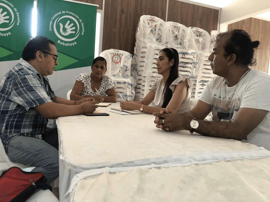 «Hasta las instalaciones del Consejo Cantonal de Protección de Derechos del cantón Babahoyo, el presidente de nuestra comunidad, Darwin Robles (Perlita), y Alfredo Navarrete, Vicepresidente, mantuvieron un diálogo con la Abg. Rosa Paz, Secretaria Ejecutiva del CCPDB (Consejo Cantonal de Protección de Derechos), de la junta cantonal de protección de derechos, la Magister Rosalía Ordóñez, Presidenta de la comisión de grupo vulnerable equidad de género, concejal del cantón, y la Tlga. Jenny Ulloa, delegada de organizaciones sociales de géneros.