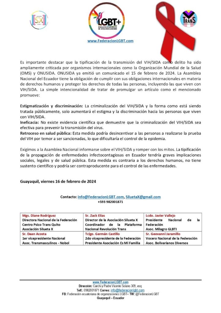 Los colectivos que conformamos a nivel nacional la Federación ecuatoriana de Organizaciones LGBT+, expresamos nuestro enérgico rechazo a la propuesta del borrador del Código Orgánico Integral Penal (COIP), en especial del artículo 216.1 presentado por los Asambleístas de la Asamblea Nacional del Ecuador. Este artículo busca criminalizar la transmisión del VIH/SIDA, lo que representa una grave amenaza para los derechos humanos de las personas que viven con esta enfermedad. La Asamblea Nacional del Ecuador, al pretender tipificar a las personas que viven con VIH/SIDA, está ignorando una serie de instrumentos. Estos instrumentos establecen la obligación de los Estados de garantizar el acceso a la salud, la igualdad y la no discriminación para todas las personas, independientemente de su estado serológico tales como: