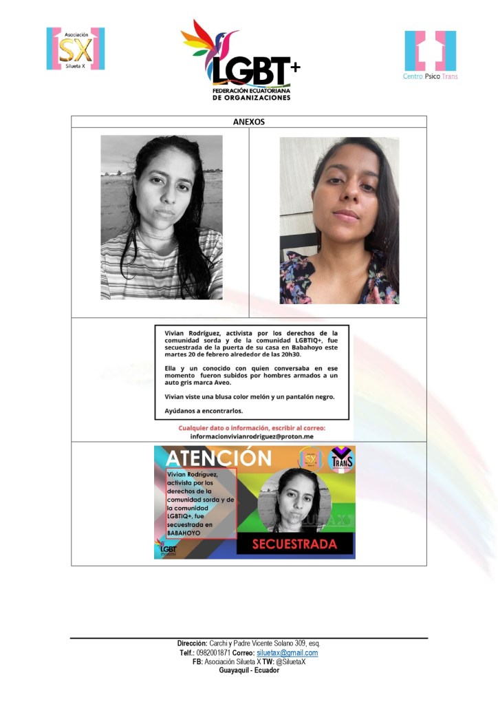 Vivian Rodríguez, una destacada activista por los derechos de la comunidad sorda y LGBTIQ+ en Babahoyo, provincia de Los Ríos es secuestrada. El incidente tuvo lugar el martes 20 de febrero a las 20:30 en la puerta de su casa en el sector El Salto.