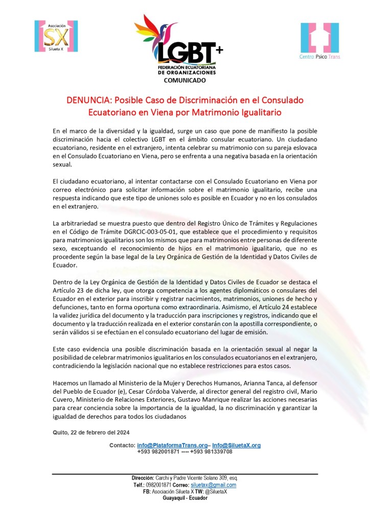 En el marco de la diversidad y la igualdad, surge un caso que pone de manifiesto la posible discriminación hacia el colectivo LGBT en el ámbito consular ecuatoriano. Un ciudadano ecuatoriano, residente en el extranjero, intenta celebrar su matrimonio con su pareja eslovaca en el Consulado Ecuatoriano en Viena, pero se enfrenta a una negativa basada en la orientación sexual.