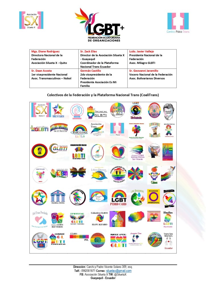 Hacemos un llamado al Ministerio de la Mujer y Derechos Humanos, Arianna Tanca, al defensor del Pueblo de Ecuador (e), Cesar Córdoba Valverde, al director general del registro civil, Mario Cuvero, Ministerio de Relaciones Exteriores, Gustavo Manrique realizar las acciones necesarias para crear conciencia sobre la importancia de la igualdad, la no discriminación y garantizar la igualdad de derechos para todos los ciudadanos