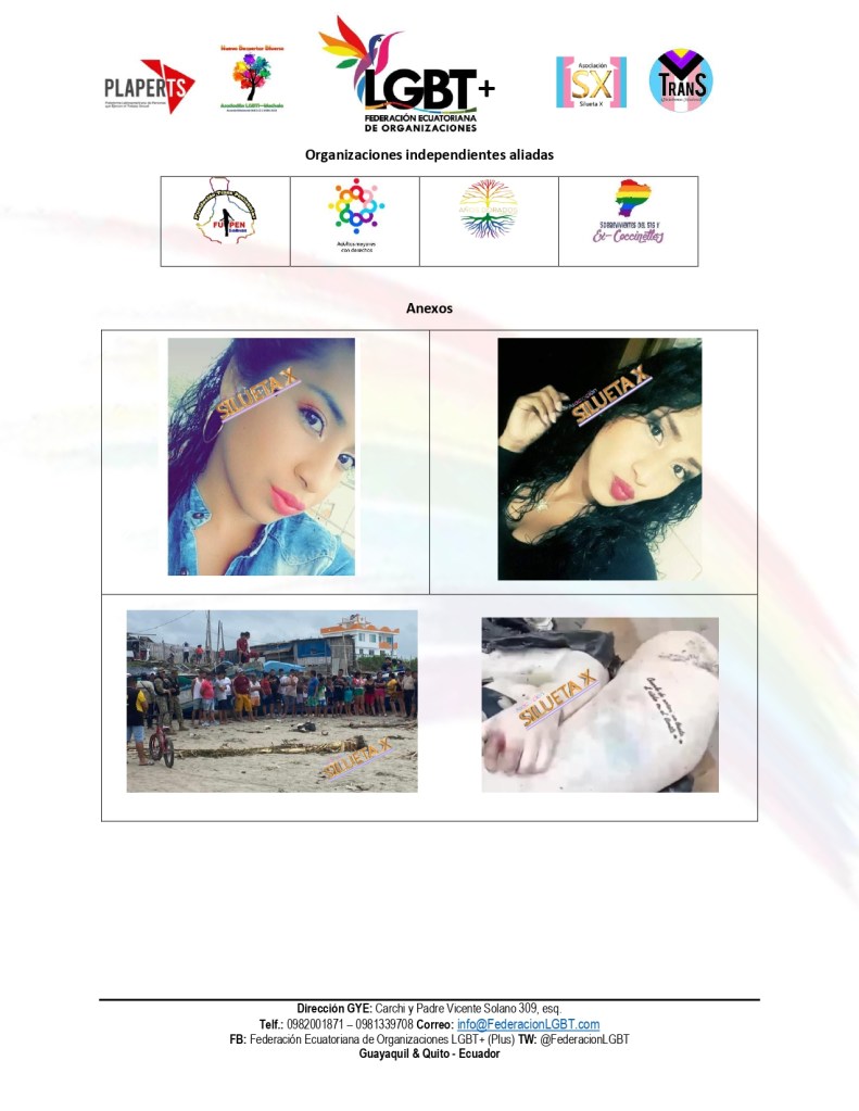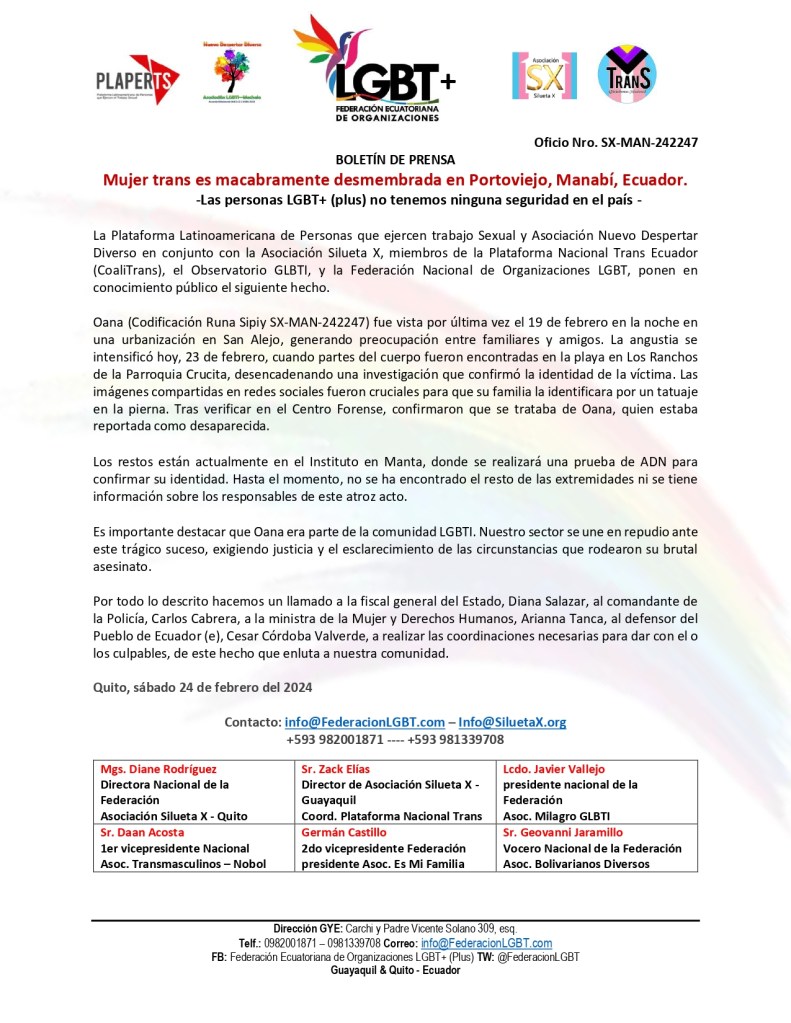 La Plataforma Latinoamericana de Personas que ejercen trabajo Sexual y Asociación Nuevo Despertar Diverso en conjunto con la Asociación Silueta X, miembros de la Plataforma Nacional Trans Ecuador (CoaliTrans), el Observatorio GLBTI, y la Federación Nacional de Organizaciones LGBT, ponen en conocimiento público el siguiente hecho.