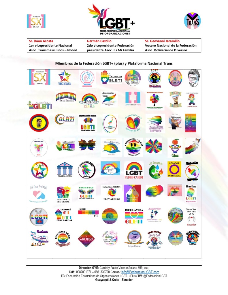 La Federación Ecuatoriana de Organizaciones LGBT+ reafirma su compromiso de seguir trabajando en colaboración con todas las partes interesadas para avanzar hacia una sociedad más justa e inclusiva para todas las personas, independientemente de su orientación sexual o identidad de género.