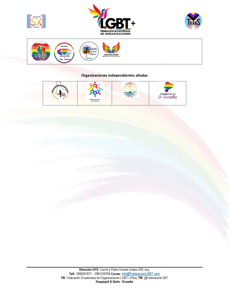 Finalmente, expresamos nuestra solidaridad con todas las personas LGBT+ que han sido afectadas por la discriminación y el odio, y reafirmamos nuestro compromiso de seguir luchando por un Ecuador donde todos podamos vivir libres de discriminación y violencia.
