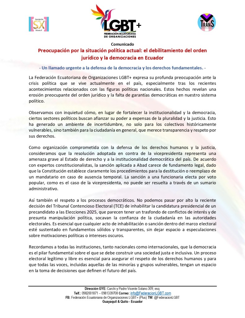La Federación Ecuatoriana de Organizaciones LGBT+ expresa su profunda preocupación ante la crisis política que se vive actualmente en el país, especialmente tras los recientes acontecimientos relacionados con las figuras políticas nacionales. Estos hechos revelan una erosión preocupante del orden jurídico y la falta de garantías democráticas en nuestro sistema político.