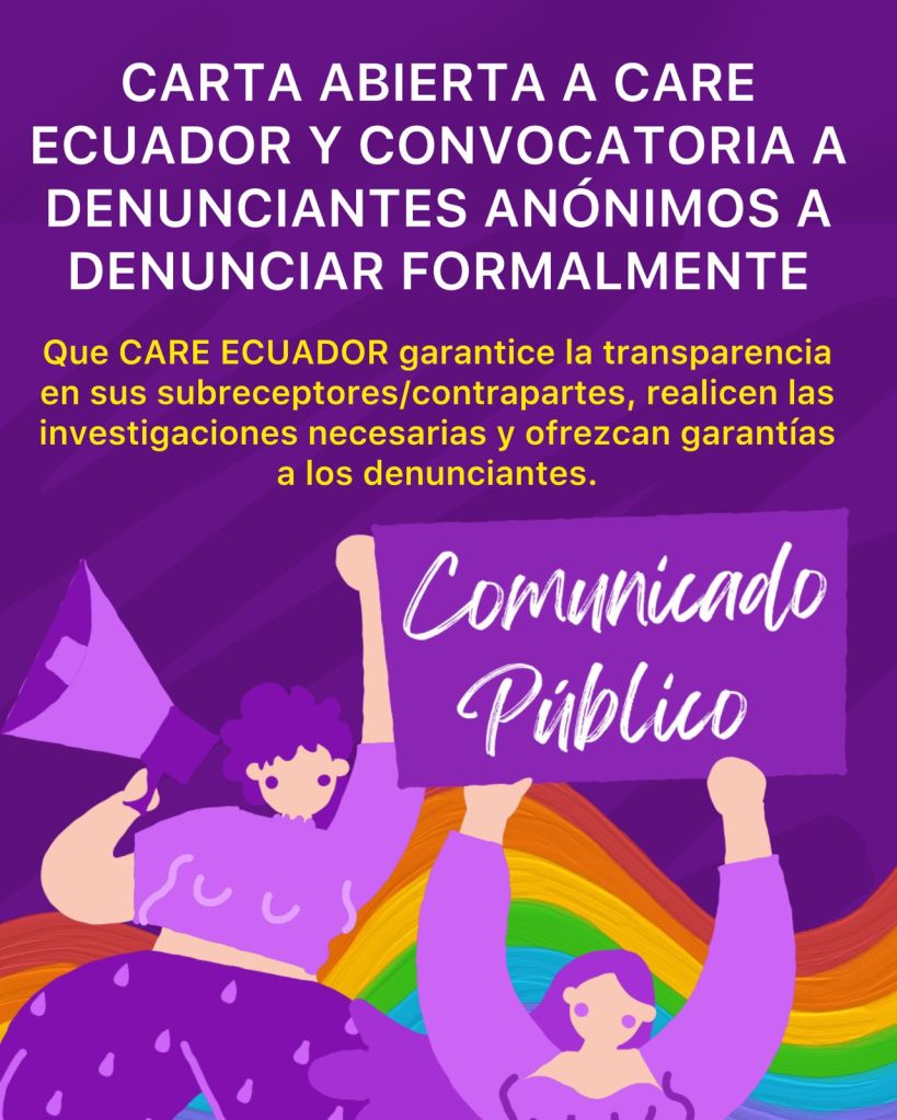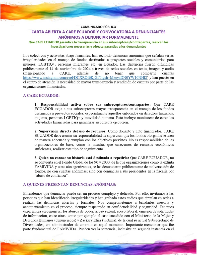 Los colectivos y activistas abajo firmantes, han recibido denuncias anónimas que señalan serias irregularidades en el manejo de fondos destinados a proyectos sociales y comunitarios para mujeres, LGBTIQ+, personas migrantes etc. en Ecuador. Las denuncias fueron difundidas públicamente el 14 de noviembre de 2024 a través de redes sociales en texto, imagen y audio (mencionando a CARE, además de no tener que compartir cuentas https://www.instagram.com/reel/DCXRQf6KjGf/?igsh=MzcyaDN0YW10NHl2) y han puesto en el centro de atención la necesidad de mayor transparencia y rendición de cuentas por parte de las organizaciones financiadas.