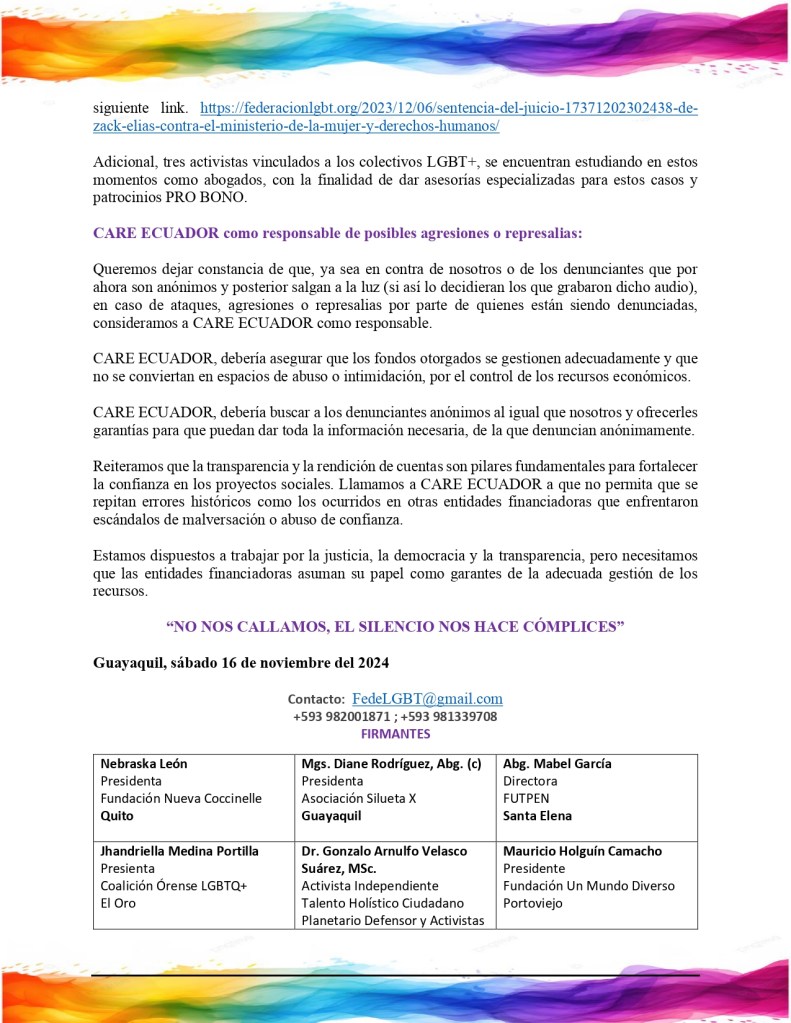 Queremos dejar constancia de que, ya sea en contra de nosotros o de los denunciantes que por ahora son anónimos y posterior salgan a la luz (si así lo decidieran los que grabaron dicho audio), en caso de ataques, agresiones o represalias por parte de quienes están siendo denunciadas, consideramos a CARE ECUADOR como responsable.