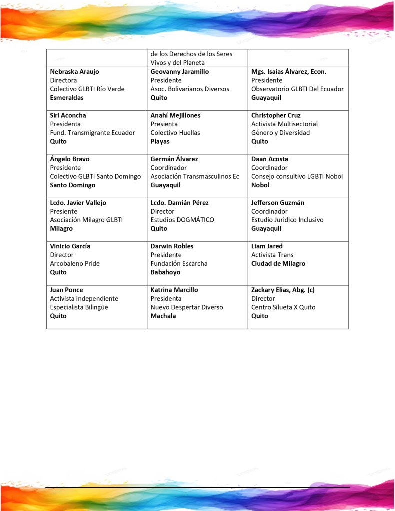 | Nebraska Araujo Directora Colectivo GLBTI Río Verde Esmeraldas | Geovanny Jaramillo Presidente Asoc. Bolivarianos Diversos Quito | Mgs. Isaías Álvarez, Econ. Presidente Observatorio GLBTI Del Ecuador Guayaquil |