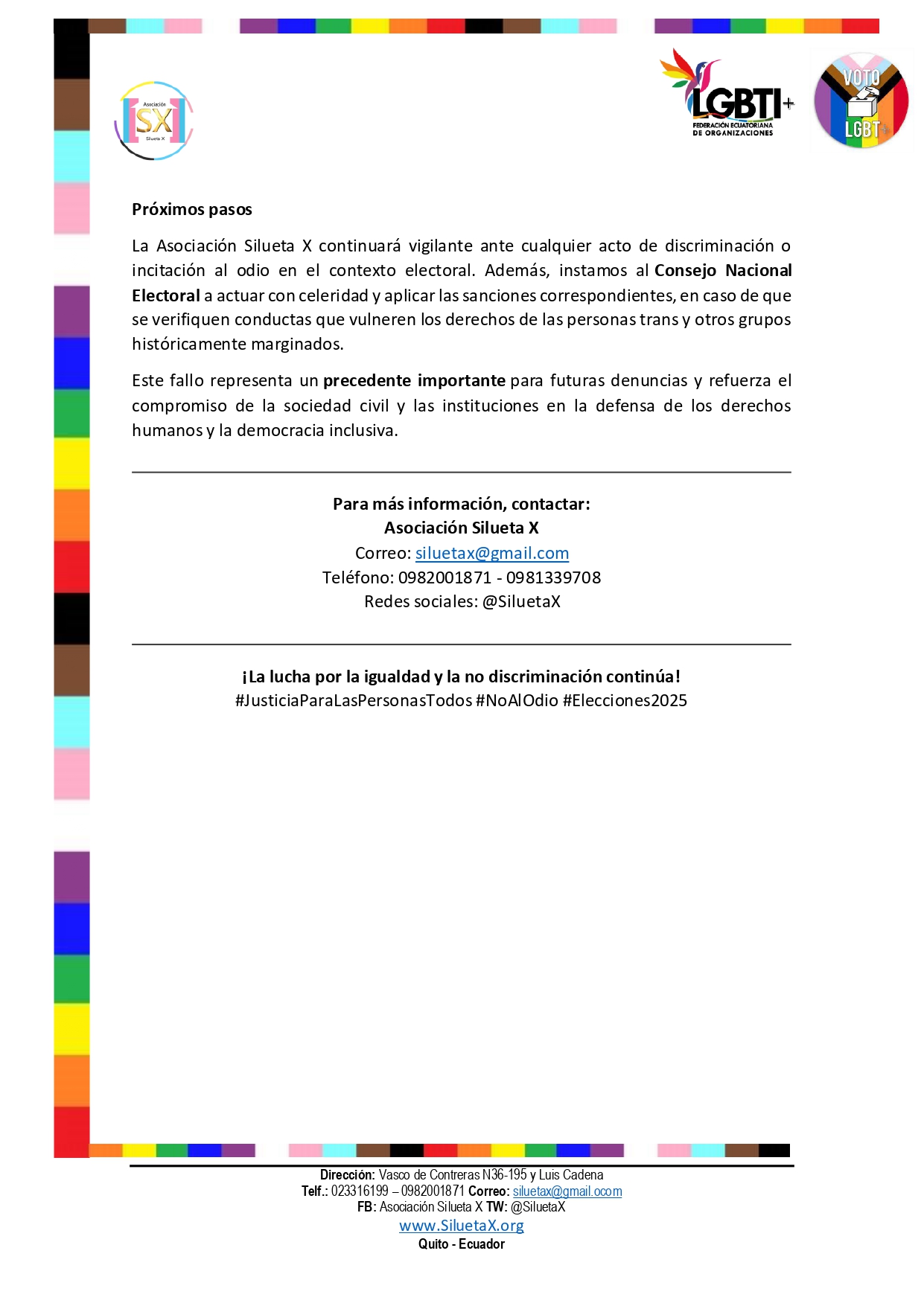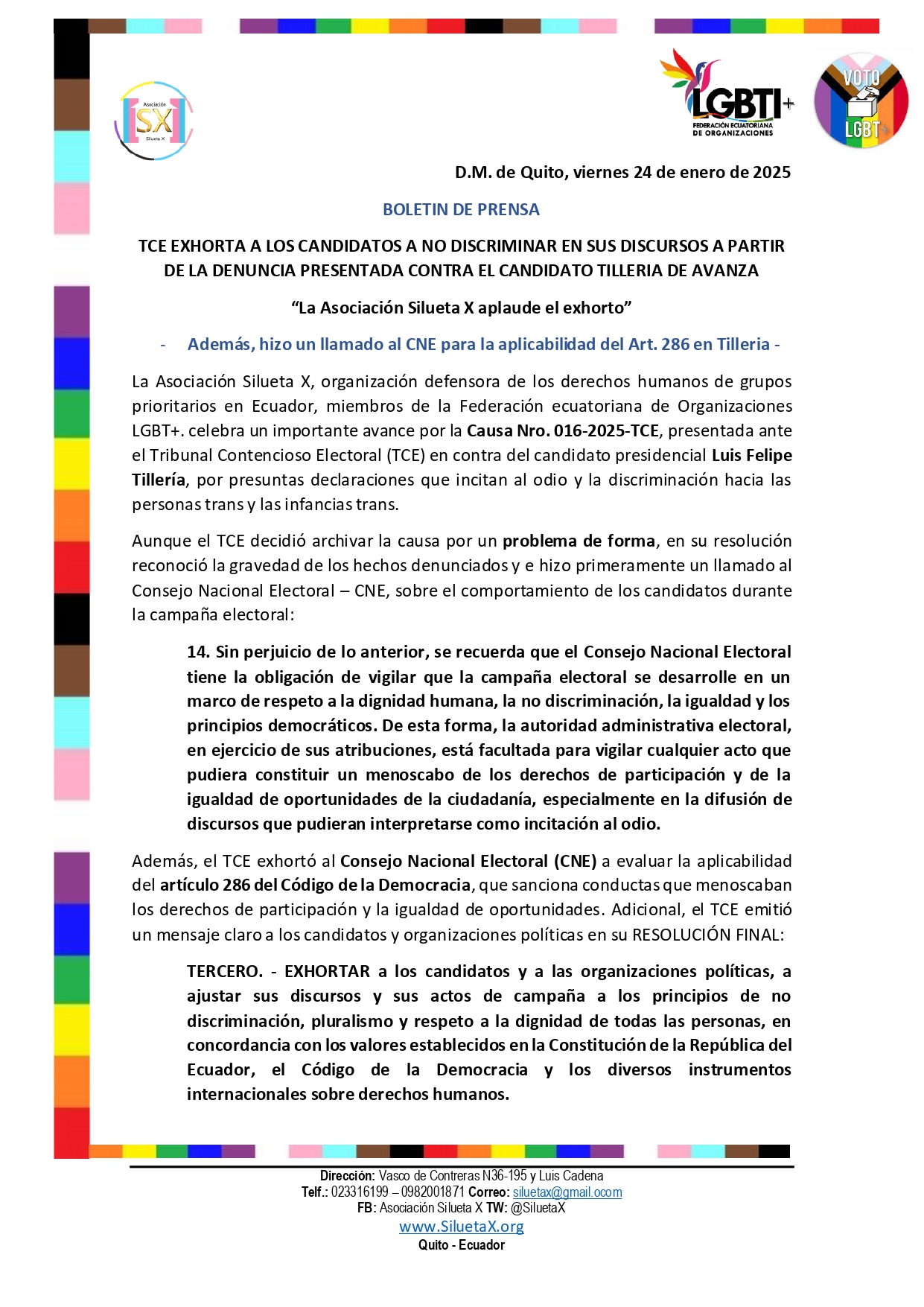 La Asociación Silueta X, organización defensora de los derechos humanos de grupos prioritarios en Ecuador, miembros de la Federación ecuatoriana de Organizaciones LGBT+. celebra un importante avance por la Causa Nro. 016-2025-TCE, presentada ante el Tribunal Contencioso Electoral (TCE) en contra del candidato presidencial Luis Felipe Tillería, por presuntas declaraciones que incitan al odio y la discriminación hacia las personas trans y las infancias trans.