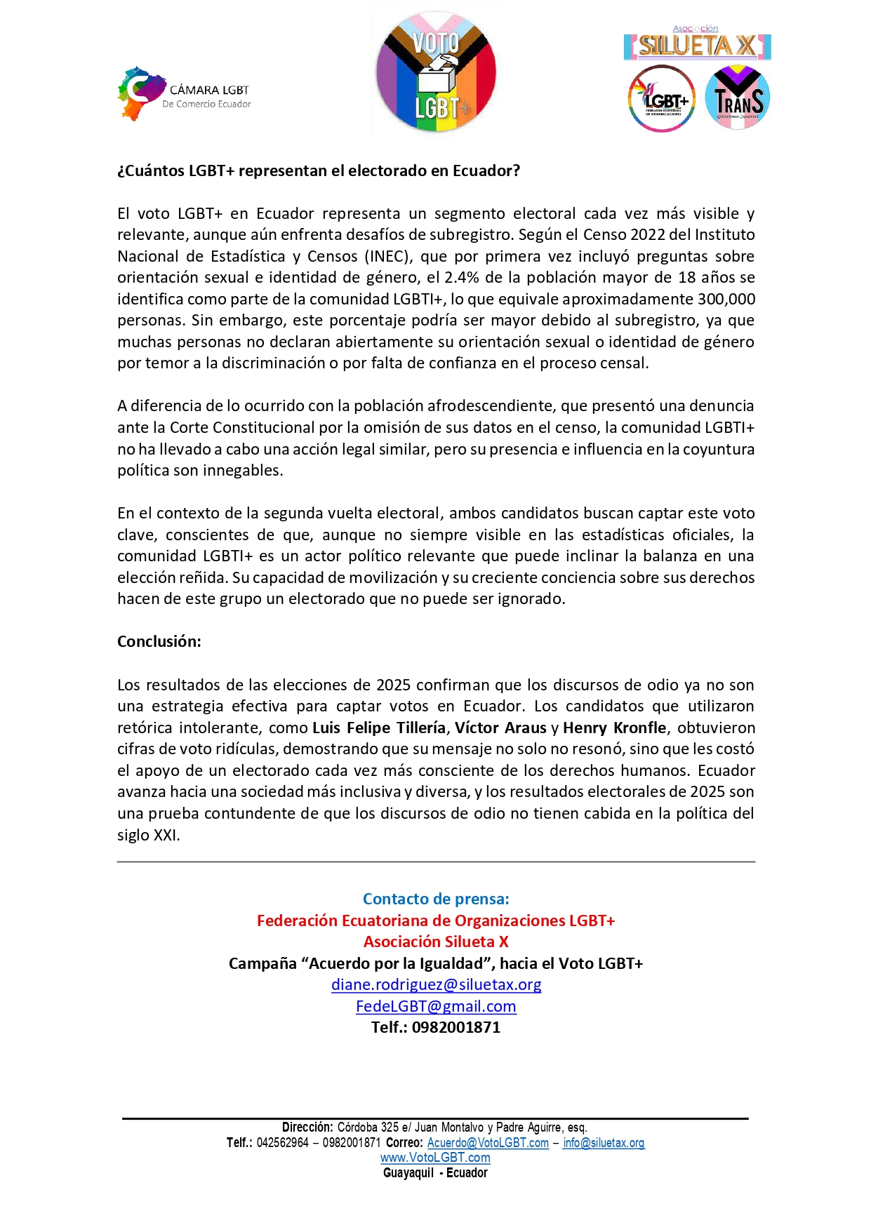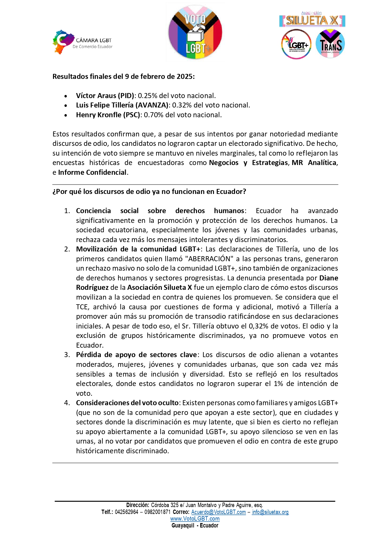 Los resultados de las elecciones generales del 9 de febrero de 2025 dejaron en evidencia que los discursos de odio, especialmente aquellos dirigidos contra la comunidad LGBT+, ya no son una estrategia viable para captar votos en Ecuador. Los candidatos Luis Felipe Tillería (AVANZA), Víctor Araus (PID), Henry Kronfle (PSC), entre otros, quienes utilizaron retórica intolerante y llamaron «aberración» a las personas trans, obtuvieron cifras de voto marginales, confirmando que su mensaje no resonó en un electorado cada vez más consciente de los derechos humanos y la diversidad. Adicional, los candidatos a la asamblea como Guillermo Celi de SUMA y Ana Belén Cordero de CREO, quienes utilizaron poliqueramente el tema de niñez trans (desinformando), no alcanzaron la curul. Esto a pesar que grupos políticos de coyuntura como FIRMES, Restauración Civil y cantantes como Fausto Miño, los apoyaron abiertamente.
