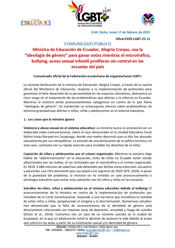 | La reciente declaración de la ministra de Educación, Alegría Crespo, a través de la cuenta oficial del Ministerio de Educación, respecto a la implementación de protocolos para garantizar el libre desarrollo de la personalidad en los espacios educativos, demuestra un claro sesgo en el tratamiento de las problemáticas que afectan a la infancia en Ecuador. Mientras la ministra emite pronunciamientos categóricos en contra de lo que llama «ideologías de género», ha mantenido un preocupante silencio sobre problemáticas de extrema gravedad que afectan a niños, niñas y adolescentes en el sistema educativo. 1.- Los casos que la ministra ignora Violencia y abuso sexual en el sistema educativo: La ministra nunca se pronunció con un elaborado video comunicacional, sobre el caso denunciado en la Unidad Educativa Fiscal Nahim Isaías Barquet en Carapungo, donde una madre denunció que su hijo fue abusado sexualmente por sus compañeros. La omisión de una declaración de la señora ministra, en este caso, contrasta con su rápida reacción para invalidar los derechos de la niñez. Captación de niños y adolescentes por el crimen organizado: Mientras la ministra elige hablar de «adoctrinamiento» en la educación, miles de niños en Ecuador están siendo adoctrinados por las mafias, al ser reclutados por el narcotráfico y el crimen organizado. En 2024, 3.086 menores de edad han sido detenidos por delitos como extorsión, secuestro y asesinato, una cifra alarmante que casi duplica los registros de 2023 (EFE, 2024). A pesar de la gravedad del problema, la ministra no ha emitido un solo pronunciamiento o estrategia educativa para evitar esta captación con los niños y niñas en las escuelas. Suicidios de niños, niñas y adolescentes en el sistema educativo debido al bullying: El pronunciamiento de la ministra en contra de la implementación de protocolos por mandato de la Corte Constitucional, responde a una narrativa que invisibiliza la realidad de estos niños y niñas, perpetuando el estigma y la discriminación. Numerosos estudios han demostrado que la falta de reconocimiento de la identidad de género está directamente relacionada con mayores tasas de depresión, ansiedad y riesgo de suicidio (Olson et al., 2016). Contamos con un caso de un reciente suicidio en la ciudad de Guayaquil, en la que un adolescente tomó la decisión de quitarse la vida debido al acoso que sufrió en las aulas a partir de su orientación sexual y/o identidad de género. Lo haremos público una vez que hayamos reunido todos los elementos necesarios, por lo que, esperaríamos una respuesta pública de usted como máxima autoridad, con un elaborado video comunicacional, como el de hoy, que prevenga el bulling en los espacios educativos ya sea por: racismo, xenofobia, aporofobia, homofobia, transfobia, etc. Además, organismos internacionales como la Comisión Interamericana de Derechos Humanos han establecido que los Estados deben garantizar el derecho al libre desarrollo de la personalidad sin discriminación por identidad de género (CIDH, 2021). En este sentido, la negativa del Ministerio de Educación de aplicar protocolos específicos es una forma de negligencia estatal, que incluso, viola el Art. 11. No.2 de la Constitución de la República del Ecuador. Es evidente que este anuncio lo realiza en el marco de una contienda electoral, como sus coidearios de la ultra derecha que perdieron. La ministra de Educación no puede desinformar con fines electorales para captar el voto del gobierno. Es su responsabilidad demostrar en qué parte del currículo educativo existe un supuesto adoctrinamiento y, si realmente trabaja con base en principios científicos, no debería recurrir a conceptos pseudocientíficos como la llamada «ideología de género», creada para fomentar segregación y odio. En lugar de desviar la atención con discursos alarmistas, usted como ministra, debe enfocarse en los verdaderos problemas de la educación: Ecuador es el segundo país con mayor deserción escolar en la región, el narcotráfico está infiltrando las aulas, y las bandas criminales reclutan niños como sicarios. Estas son las amenazas reales que requieren acción inmediata. Eso es lo que debe preocuparle, señora ministra. Su silencio, ante los abusos sexuales en escuelas, la captación de niños por las mafias y los suicidios en casos de acoso, demuestran que usted es la responsable y que aparte, sostiene los problemas estructurales que ponen en peligro la vida de miles de niños y niñas en Ecuador. Desde la Federación Ecuatoriana de Organizaciones LGBT+, reiteramos nuestro compromiso con la defensa de los derechos humanos y exigimos que el Ministerio de Educación actúe con la misma diligencia para enfrentar las verdaderas amenazas que afectan a la infancia ecuatoriana. Contacto: Federación Ecuatoriana de Organizaciones LGBT+ FedeLGBT@gmail.com Telf.: 0982001871 |