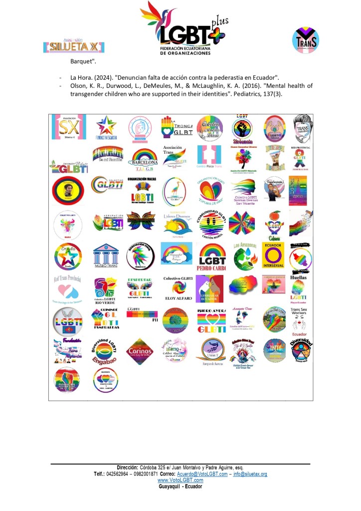 | Referencias Comisión Interamericana de Derechos Humanos (CIDH). (2021). «Avances y desafíos en la garantía de los derechos de las personas LGBTI en las Américas». OEA.EFE. (2024). «Más de 3.000 menores detenidos en Ecuador por delitos graves en 2024». Agencia EFE. El Universo. (2024). «Denuncian abuso sexual en la Unidad Educativa Fiscal Nahim Isaías Barquet». La Hora. (2024). «Denuncian falta de acción contra la pederastia en Ecuador». Olson, K. R., Durwood, L., DeMeules, M., & McLaughlin, K. A. (2016). «Mental health of transgender children who are supported in their identities». Pediatrics, 137(3). |