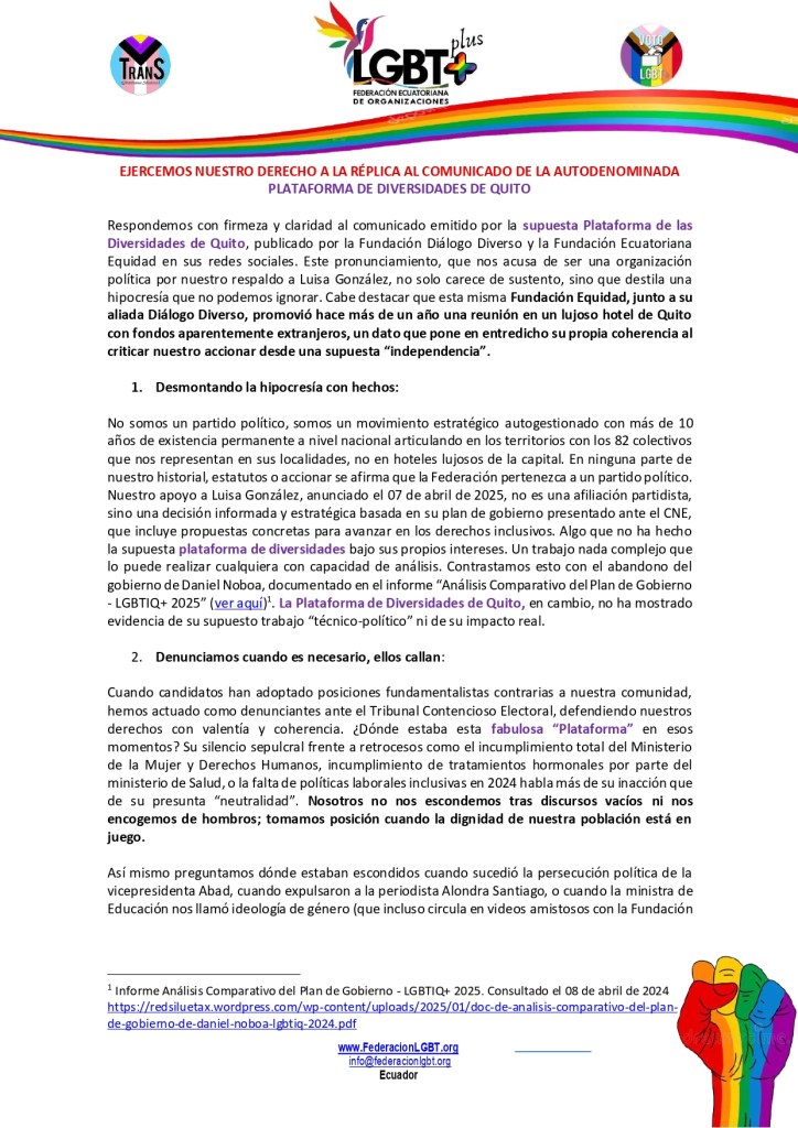 Respondemos con firmeza y claridad al comunicado emitido por la supuesta Plataforma de las Diversidades de Quito, publicado por la Fundación Diálogo Diverso y la Fundación Ecuatoriana Equidad en sus redes sociales. Este pronunciamiento, que nos acusa de ser una organización política por nuestro respaldo a Luisa González, no solo carece de sustento, sino que destila una hipocresía que no podemos ignorar. Cabe destacar que esta misma Fundación Equidad, junto a su aliada Diálogo Diverso, promovió hace más de un año una reunión en un lujoso hotel de Quito con fondos aparentemente extranjeros, un dato que pone en entredicho su propia coherencia al criticar nuestro accionar desde una supuesta “independencia”.