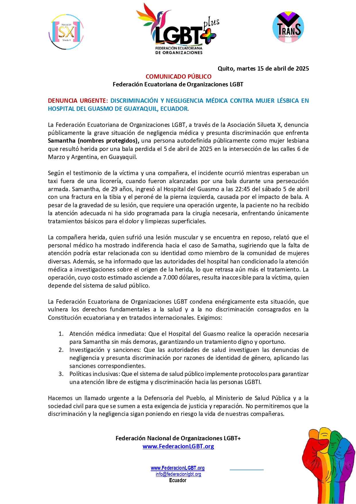 La Federación Ecuatoriana de Organizaciones LGBT, a través de la Asociación Silueta X, denuncia públicamente la grave situación de negligencia médica y presunta discriminación que enfrenta Samantha (nombres protegidos), una persona autodefinida públicamente como mujer lesbiana que resultó herida por una bala perdida el 5 de abril de 2025 en la intersección de las calles 6 de Marzo y Argentina, en Guayaquil.