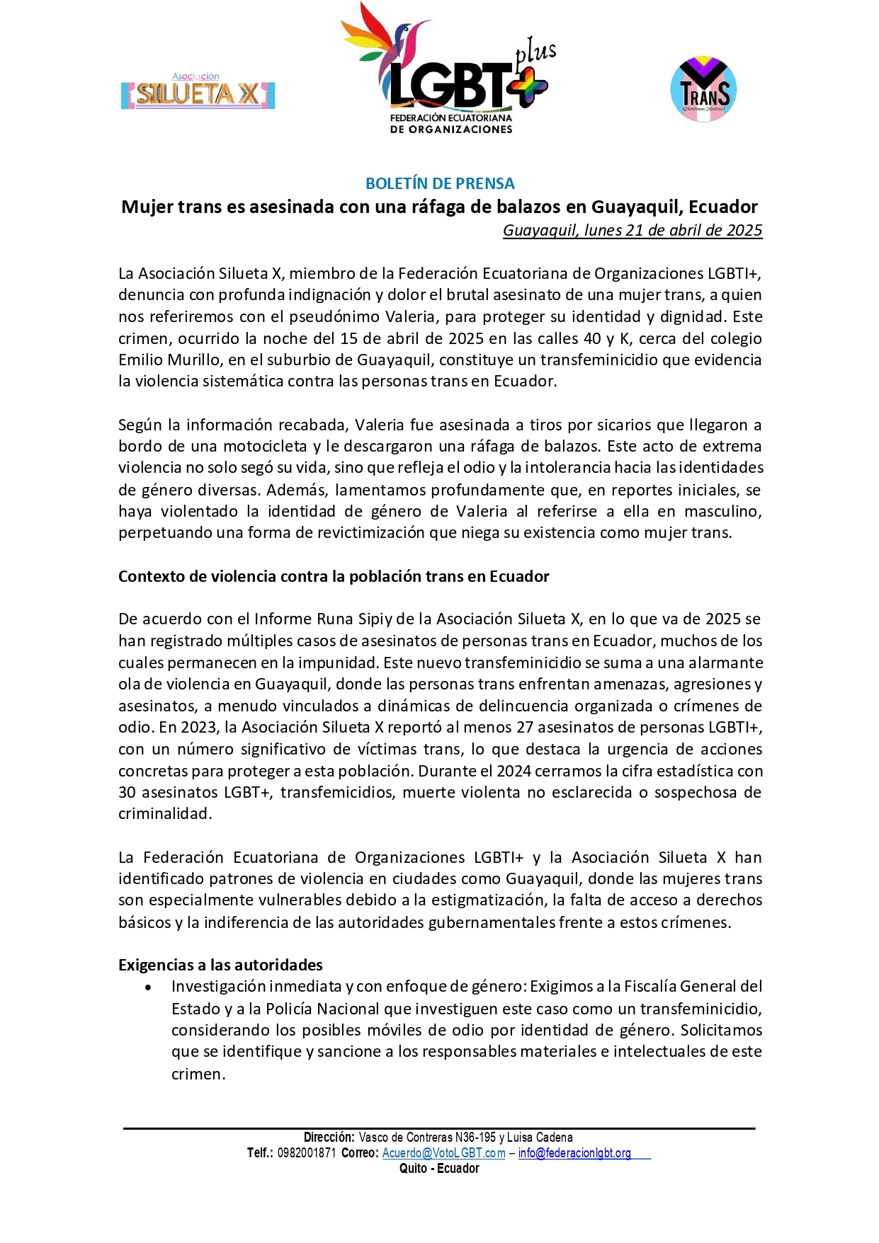 La Asociación Silueta X y la Federación Ecuatoriana de Organizaciones LGBTI+ expresamos nuestras condolencias a las amistades y familiares de Valeria, y reafirmamos nuestro compromiso de seguir luchando por la justicia, la dignidad y los derechos de las personas trans en Ecuador.