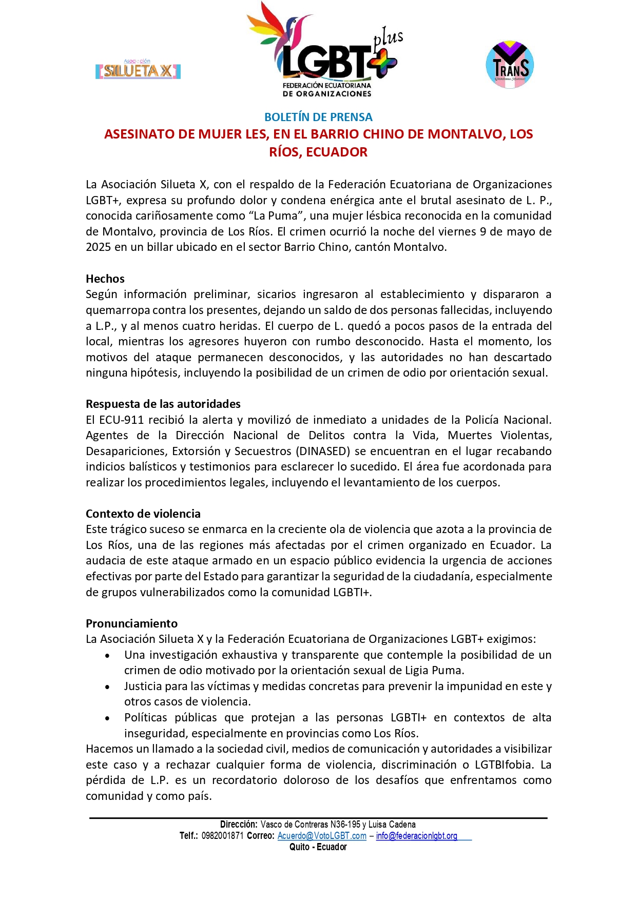 La Asociación Silueta X, con el respaldo de la Federación Ecuatoriana de Organizaciones LGBT+, expresa su profundo dolor y condena enérgica ante el brutal asesinato de L. P., conocida cariñosamente como “La Puma”, una mujer lésbica reconocida en la comunidad de Montalvo, provincia de Los Ríos. El crimen ocurrió la noche del viernes 9 de mayo de 2025 en un billar ubicado en el sector Barrio Chino, cantón Montalvo.