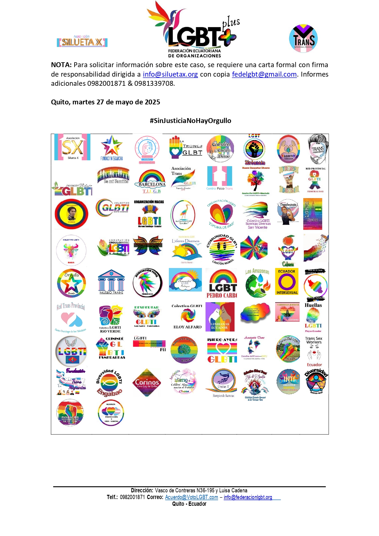 La Asociación Silueta X y la Federación Ecuatoriana de Organizaciones LGBT+ exigimos: