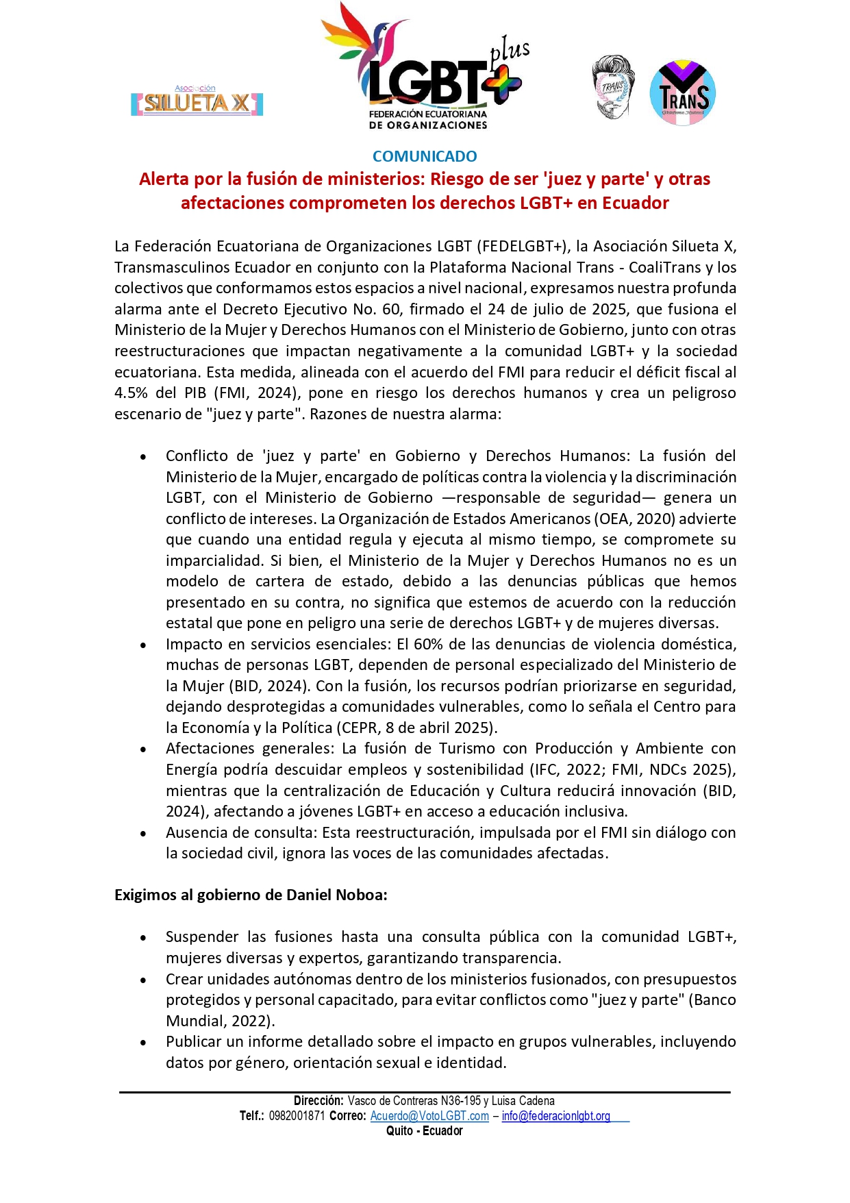 La Federación Ecuatoriana de Organizaciones LGBT (FEDELGBT+), la Asociación Silueta X, Transmasculinos Ecuador en conjunto con la Plataforma Nacional Trans – CoaliTrans y los colectivos que conformamos estos espacios a nivel nacional, expresamos nuestra profunda alarma ante el Decreto Ejecutivo No. 60, firmado el 24 de julio de 2025, que fusiona el Ministerio de la Mujer y Derechos Humanos con el Ministerio de Gobierno, junto con otras reestructuraciones que impactan negativamente a la comunidad LGBT+ y la sociedad ecuatoriana. Esta medida, alineada con el acuerdo del FMI para reducir el déficit fiscal al 4.5% del PIB (FMI, 2024), pone en riesgo los derechos humanos y crea un peligroso escenario de «juez y parte». Razones de nuestra alarma: