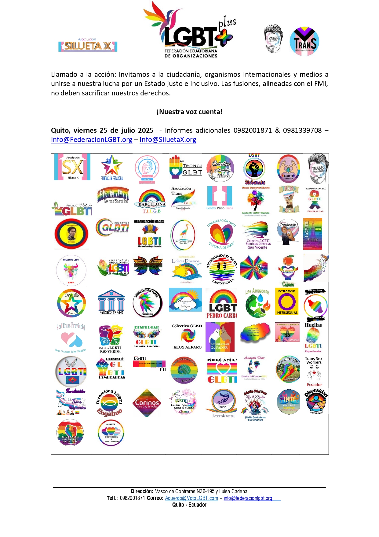Quito, viernes 25 de julio 2025 – Informes adicionales 0982001871 & 0981339708 – Info@FederacionLGBT.org – Info@SiluetaX.org