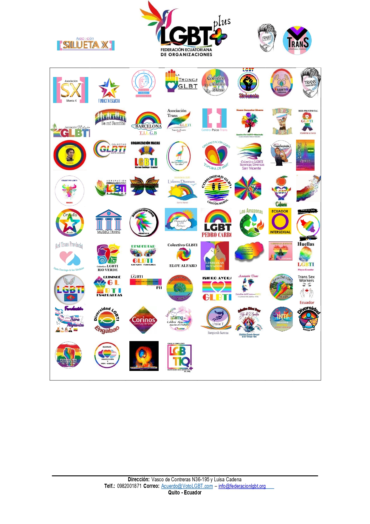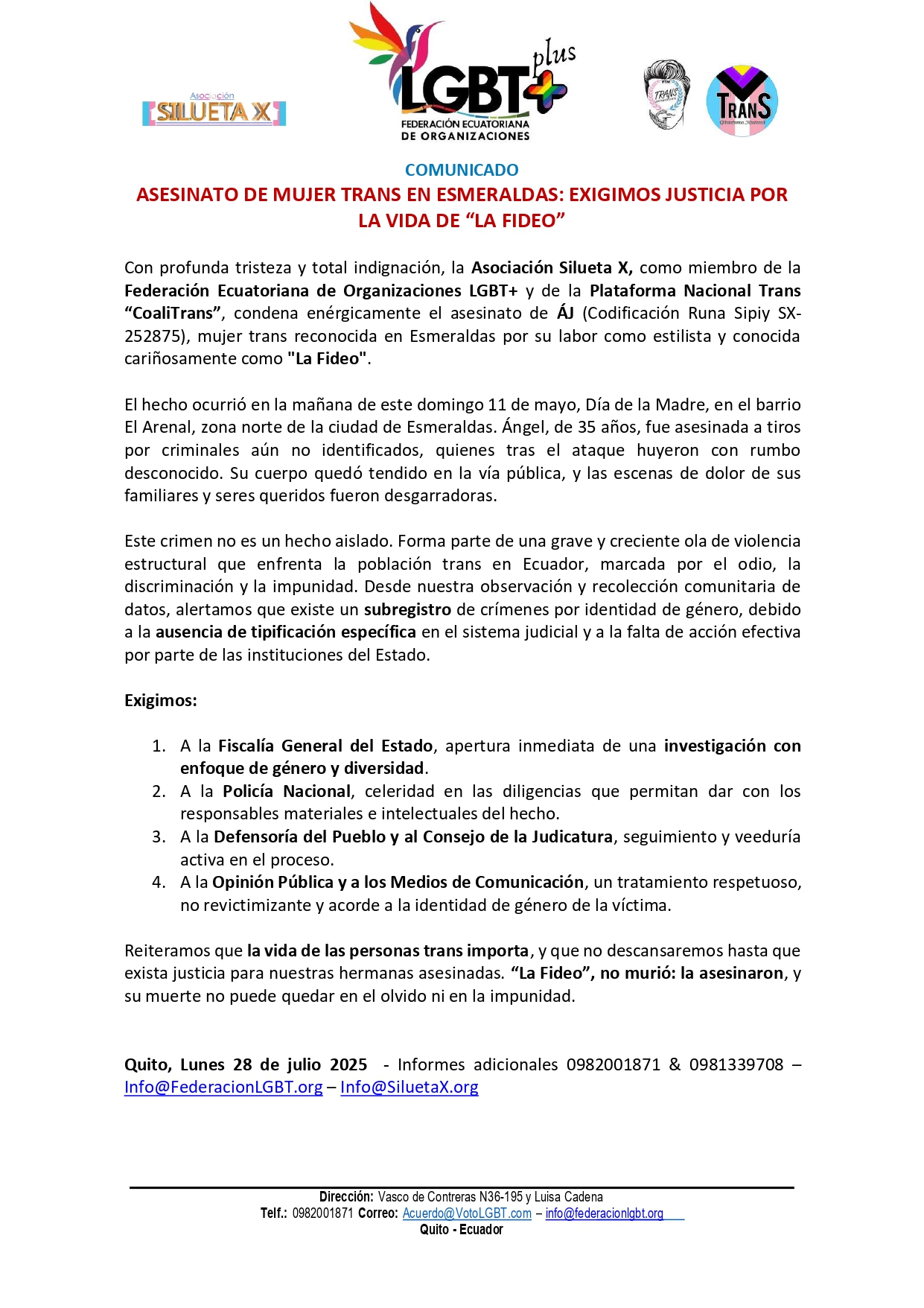 Quito, Lunes 28 de julio 2025 – Informes adicionales 0982001871 & 0981339708 – Info@FederacionLGBT.org – Info@SiluetaX.org