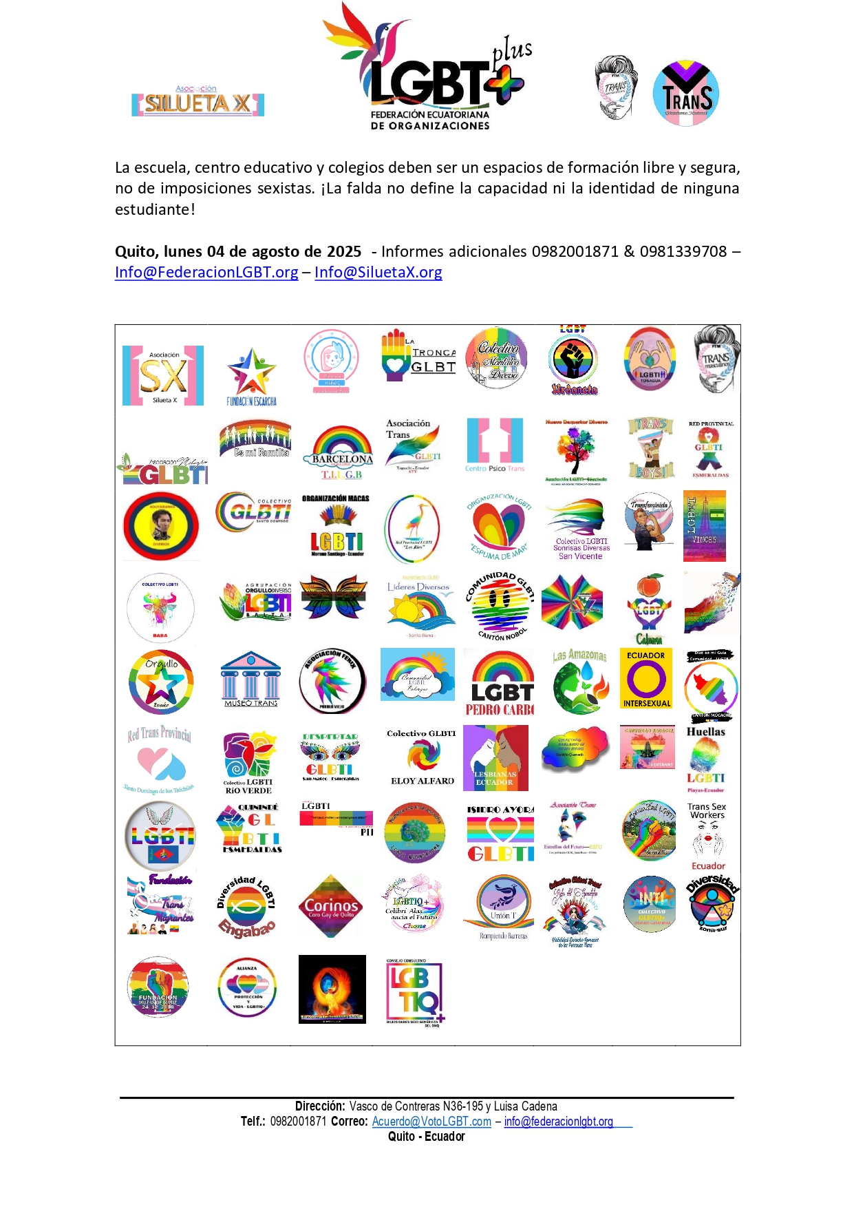 Quito, lunes 04 de agosto de 2025 – Informes adicionales 0982001871 & 0981339708 – Info@FederacionLGBT.org – Info@SiluetaX.org