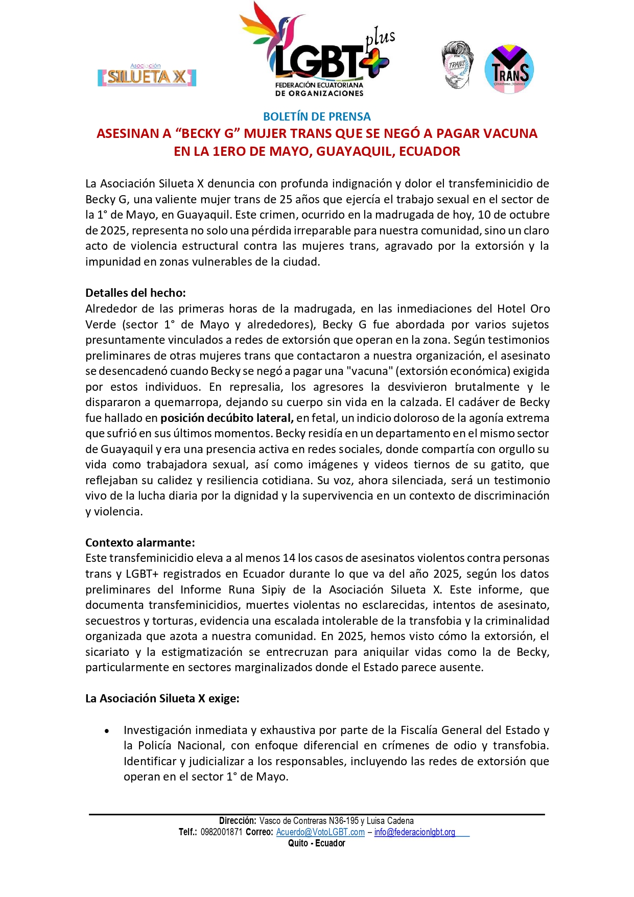 La Asociación Silueta X denuncia con profunda indignación y dolor el transfeminicidio de Becky G, una valiente mujer trans de 25 años que ejercía el trabajo sexual en el sector de la 1° de Mayo, en Guayaquil. Este crimen, ocurrido en la madrugada de hoy, 10 de octubre de 2025, representa no solo una pérdida irreparable para nuestra comunidad, sino un claro acto de violencia estructural contra las mujeres trans, agravado por la extorsión y la impunidad en zonas vulnerables de la ciudad.