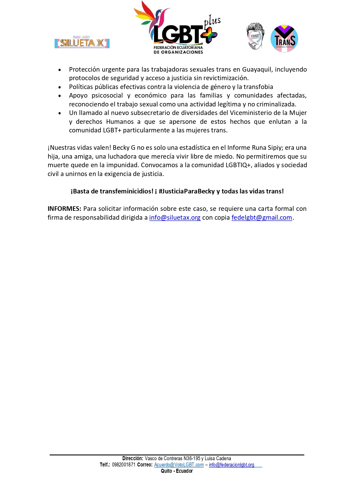 - Investigación inmediata y exhaustiva por parte de la Fiscalía General del Estado y la Policía Nacional, con enfoque diferencial en crímenes de odio y transfobia. Identificar y judicializar a los responsables, incluyendo las redes de extorsión que operan en el sector 1° de Mayo.