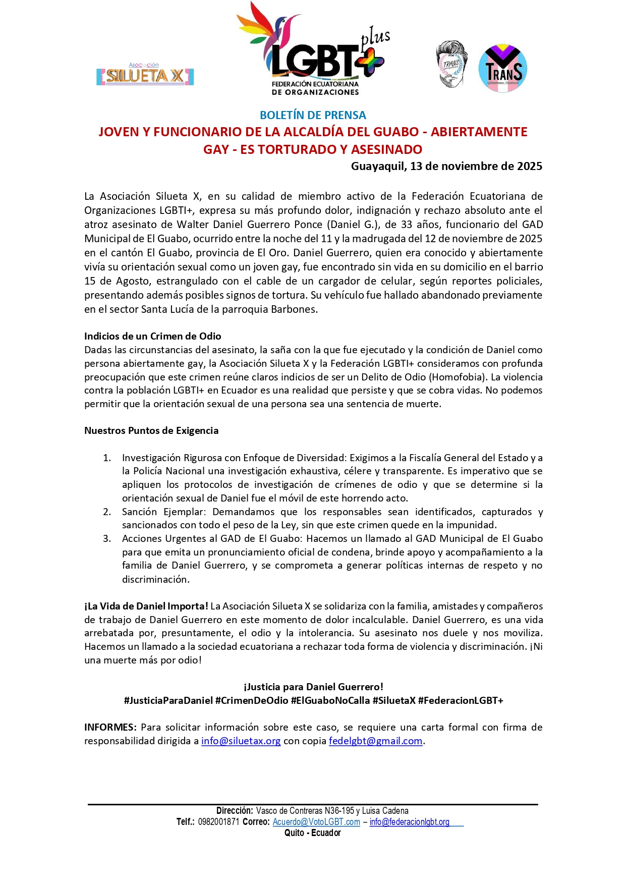 La Asociación Silueta X, en su calidad de miembro activo de la Federación Ecuatoriana de Organizaciones LGBTI+, expresa su más profundo dolor, indignación y rechazo absoluto ante el atroz asesinato de Walter Daniel Guerrero Ponce (Daniel G.), de 33 años, funcionario del GAD Municipal de El Guabo, ocurrido entre la noche del 11 y la madrugada del 12 de noviembre de 2025 en el cantón El Guabo, provincia de El Oro. Daniel Guerrero, quien era conocido y abiertamente vivía su orientación sexual como un joven gay, fue encontrado sin vida en su domicilio en el barrio 15 de Agosto, estrangulado con el cable de un cargador de celular, según reportes policiales, presentando además posibles signos de tortura. Su vehículo fue hallado abandonado previamente en el sector Santa Lucía de la parroquia Barbones.