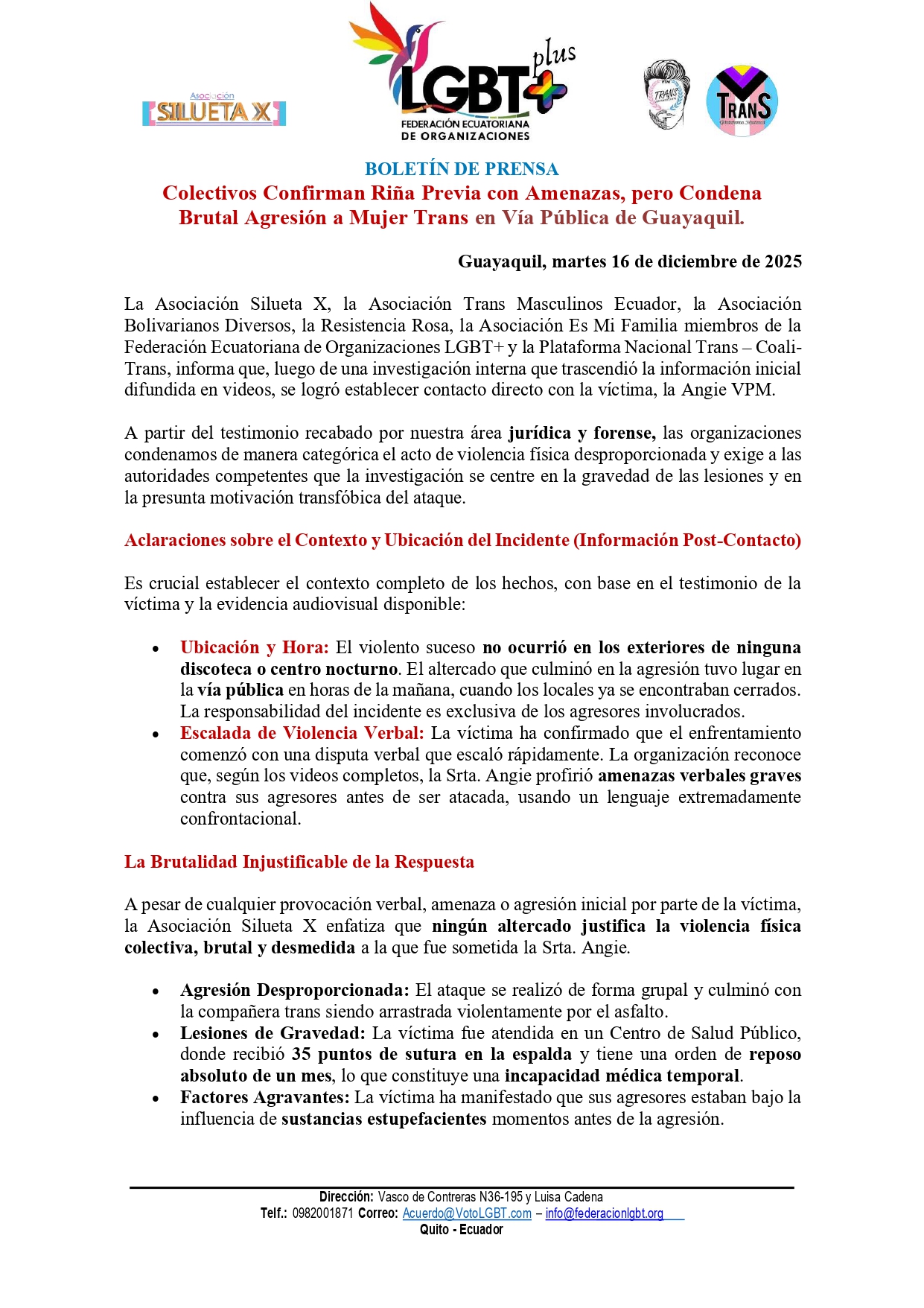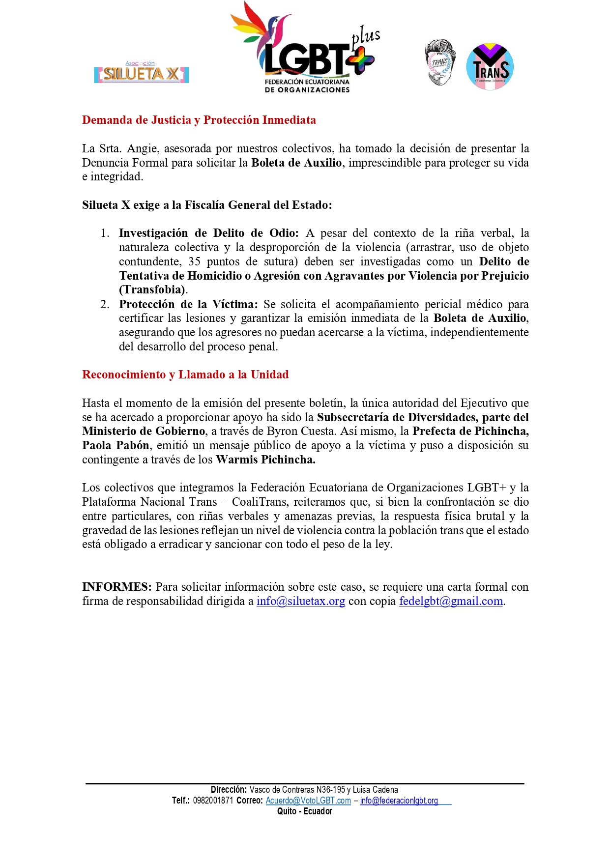 La Asociación Silueta X, la Asociación Trans Masculinos Ecuador, la Asociación Bolivarianos Diversos, la Resistencia Rosa, la Asociación Es Mi Familia miembros de la Federación Ecuatoriana de Organizaciones LGBT+ y la Plataforma Nacional Trans – Coali-Trans, informa que, luego de una investigación interna que trascendió la información inicial difundida en videos, se logró establecer contacto directo con la víctima, la Angie VPM.