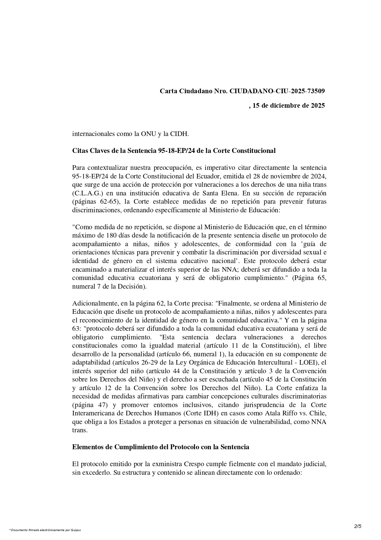 Adicionalmente: «Finalmente, se ordena al Ministerio de Educación que diseñe un protocolo de acompañamiento a niñas, niños y adolescentes para el reconocimiento de la identidad de género en la comunidad educativa.» (Pág. 62); y «protocolo deberá ser difundido a toda la comunidad educativa ecuatoriana y será de obligatorio cumplimiento.» (Pág. 63).