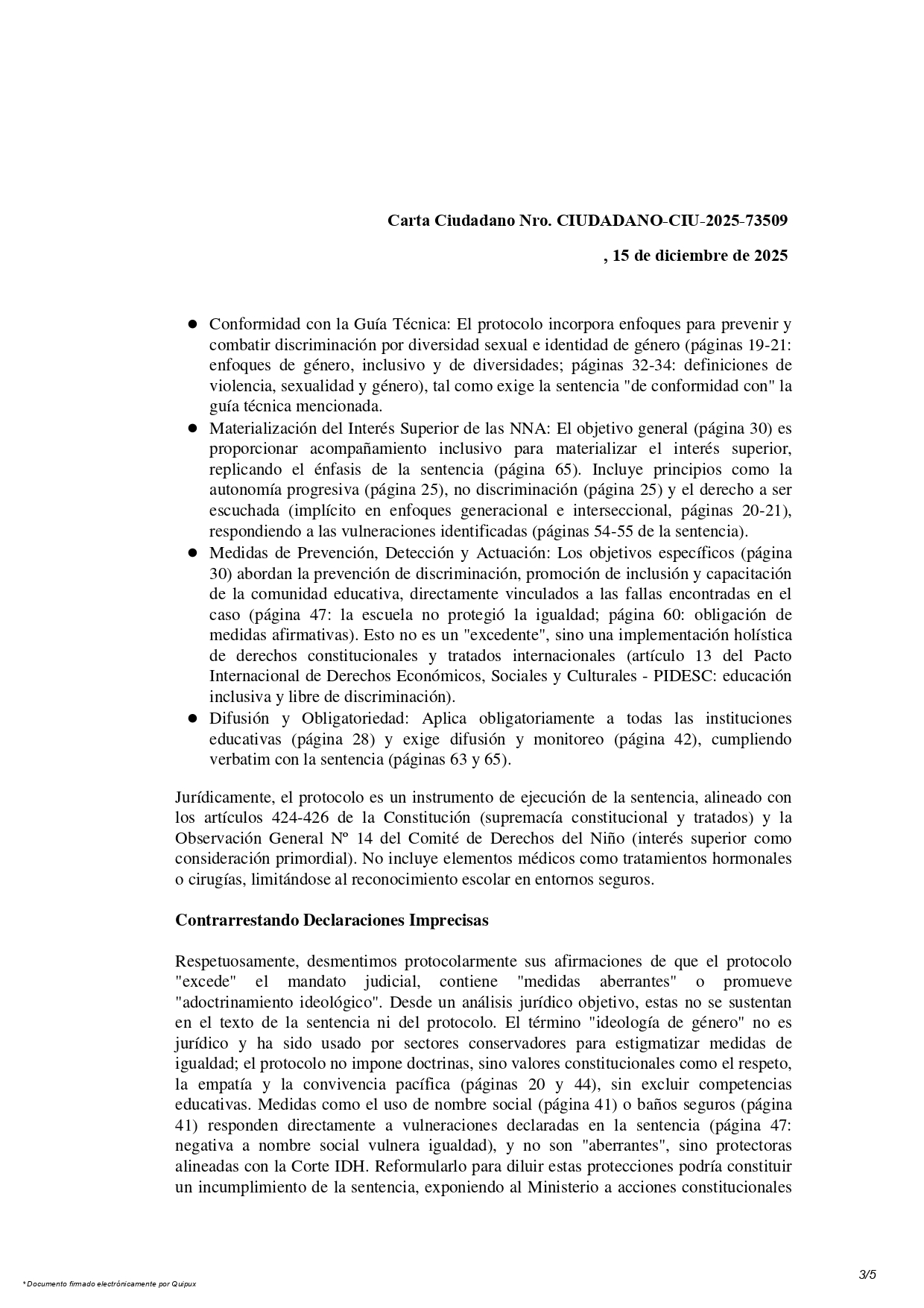 Desmentimos que el protocolo «excede» o contenga «medidas aberrantes»: no impone «ideología de género» (término no jurídico), sino valores constitucionales como respeto y convivencia (págs. 20, 44). Medidas como nombre social o baños seguros (pág. 41) responden a vulneraciones (pág. 47 sentencia), sin elementos médicos. Reformularlo diluyendo protecciones violaría art. 93 Constitución.