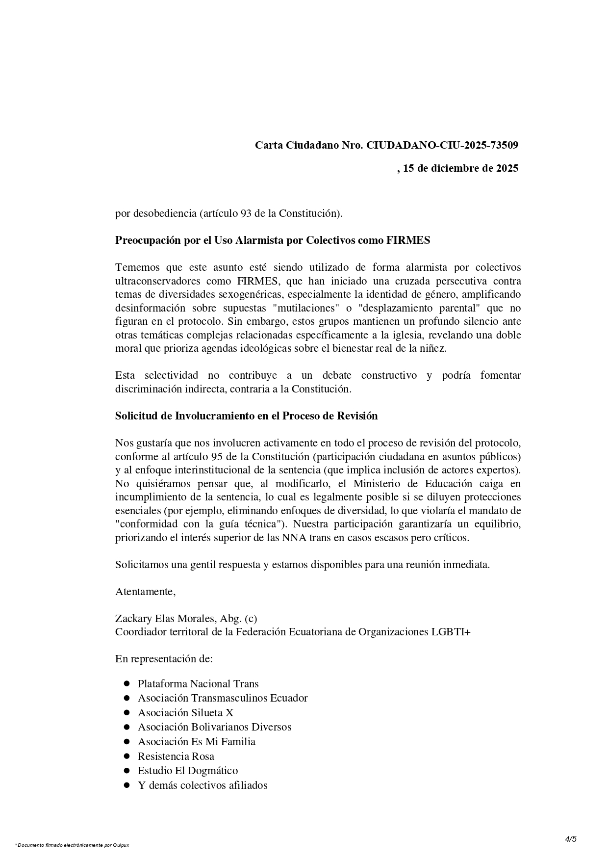 La Federación Ecuatoriana de Organizaciones LGBTI+, integrada por entidades como la Plataforma Nacional Trans, Asociación Transmasculinos Ecuador, Asociación Silueta X, Asociación Bolivarianos Diversos, Asociación Es Mi Familia, Resistencia Rosa, Estudio El Dogmático y otros colectivos aliados, expresa su profunda preocupación por las declaraciones públicas de la Ministra de Educación, Deporte y Cultura, Gilda Alcívar, respecto al «Protocolo de acompañamiento a niñas, niños y adolescentes para el reconocimiento de la identidad de género en la comunidad educativa».