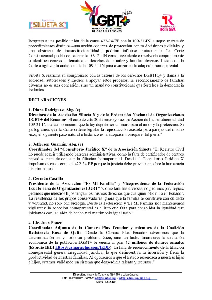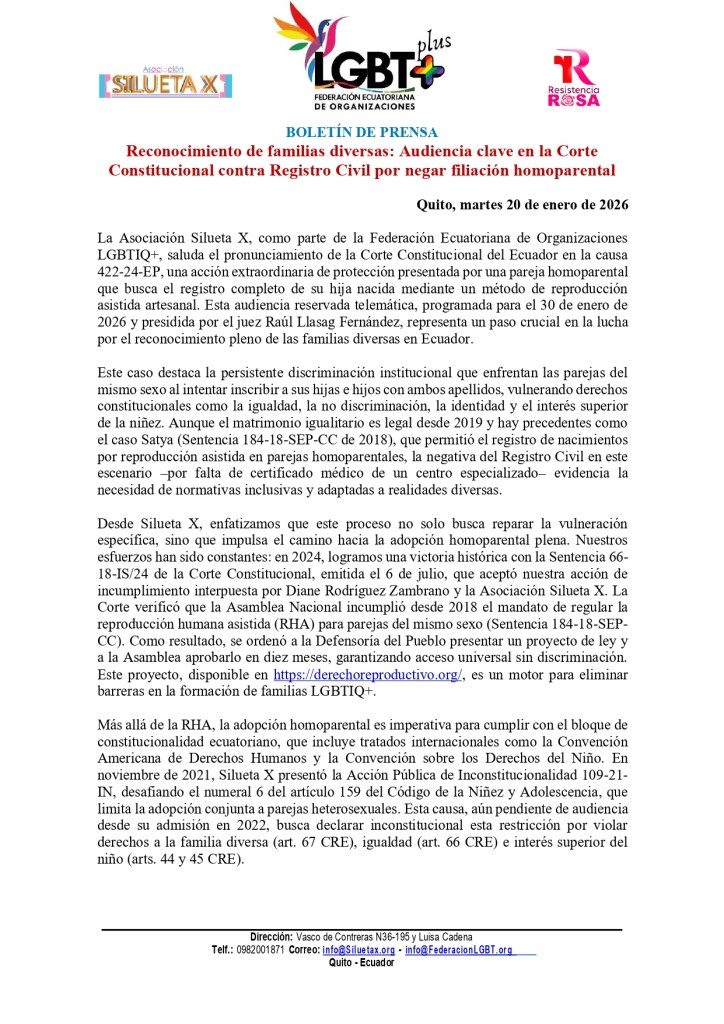 La Asociación Silueta X, como parte de la Federación Ecuatoriana de Organizaciones LGBTIQ+, saluda el pronunciamiento de la Corte Constitucional del Ecuador en la causa 422-24-EP, una acción extraordinaria de protección presentada por una pareja homoparental que busca el registro completo de su hija nacida mediante un método de reproducción asistida artesanal. Esta audiencia reservada telemática, programada para el 30 de enero de 2026 y presidida por el juez Raúl Llasag Fernández, representa un paso crucial en la lucha por el reconocimiento pleno de las familias diversas en Ecuador.