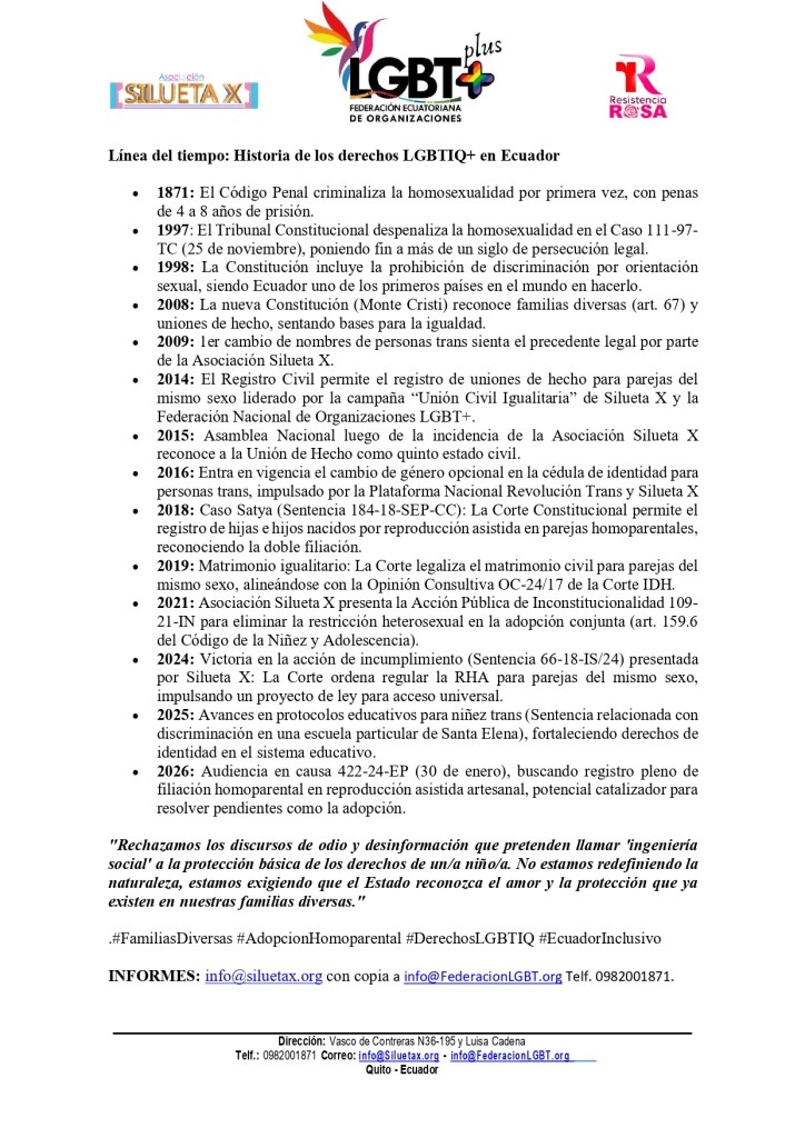 - 2021: Asociación Silueta X presenta la Acción Pública de Inconstitucionalidad 109-21-IN para eliminar la restricción heterosexual en la adopción conjunta (art. 159.6 del Código de la Niñez y Adolescencia).