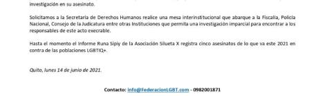 Transcribimos integramente comunicado: BOLETÍN DE PRENSA Mujer trans es asesinada a golpes en su domicilio en Guayaquil – Ecuador El Centro Psico Trans de la Asociación Silueta X, miembros de […]