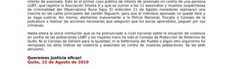 Boletín de Prensa Por medio de la presente, la Asociación Silueta X, miembro de la Federación Ecuatoriana de Organizaciones LGBTI pone en conocimiento lo siguiente: El día Sábado 24 de […]