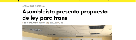 Asambleísta presenta propuesta de ley para trans La primera asambleísta transexual del Ecuador, Diane Rodríguez presentó este 25 de julio de 2017, una propuesta para la modificación de la Ley orgánica de gestión de […]