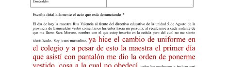 Colegio discrimina a trans en Esmeraldas Oficio D11-120717 Dirección de correo electrónico * dimezander13@gmail.com Nombres y Apellidos del denunciante * Moreno Marmolejo Número de cédula del denunciante 0804399715 Celular del […]
