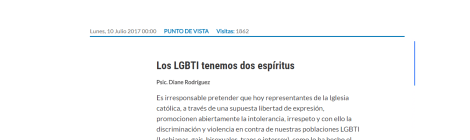 Los LGBTI tenemos dos espíritus Psic. Diane Rodríguez Es irresponsable pretender que hoy representantes de la Iglesia católica, a través de una supuesta libertad de expresión, promocionen abiertamente la intolerancia, […]
