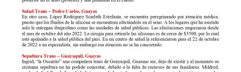 BOLETÍN DE PRENSA: Una mujer trans en Portoviejo pide justicia; Mujer trans en Pedro Carbo solicita ayuda al Ministerio de Salud; Una madre de una mujer trans fallecida, solicita apoyo por gastos mortuorios en Guayaquil.